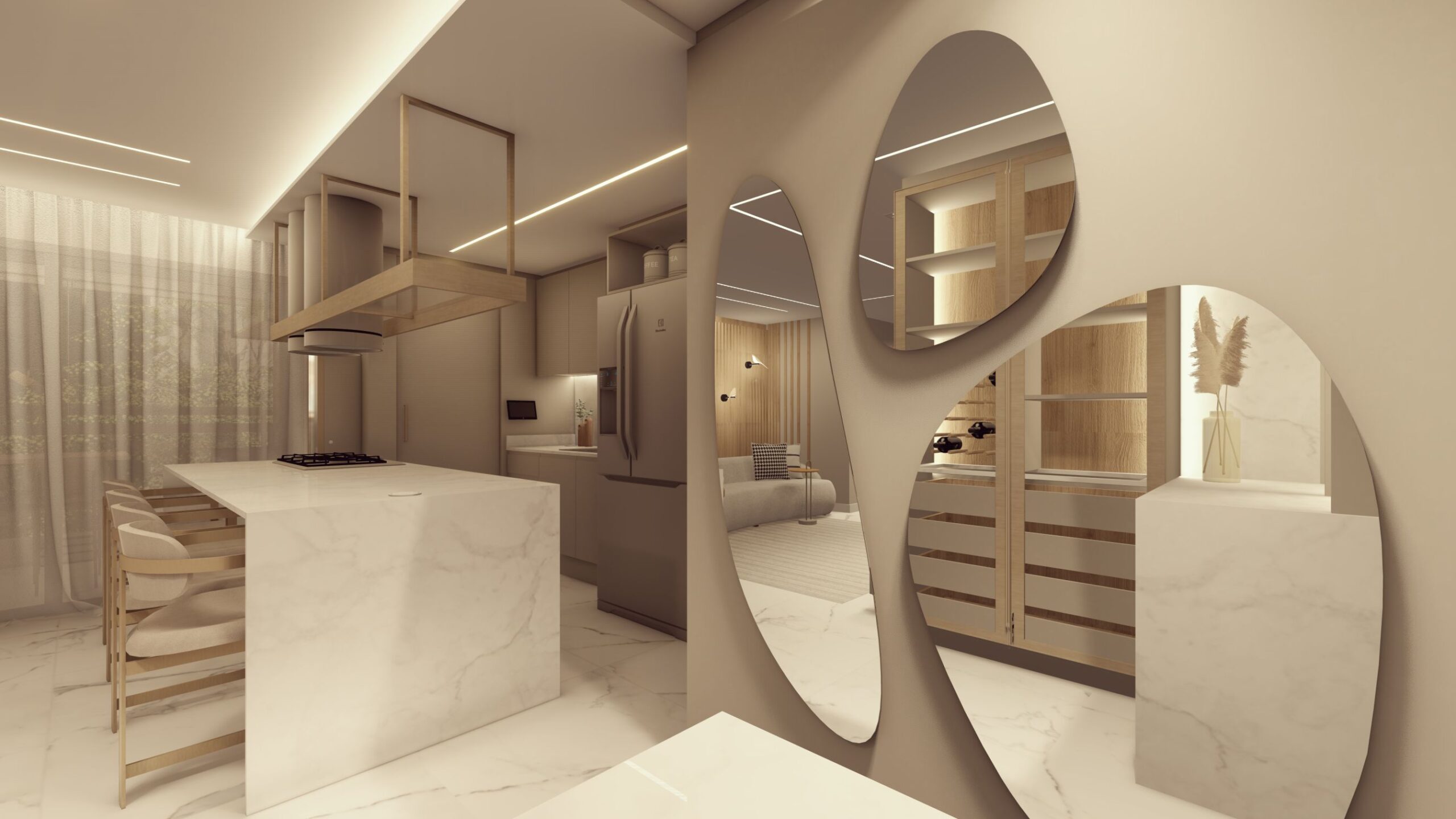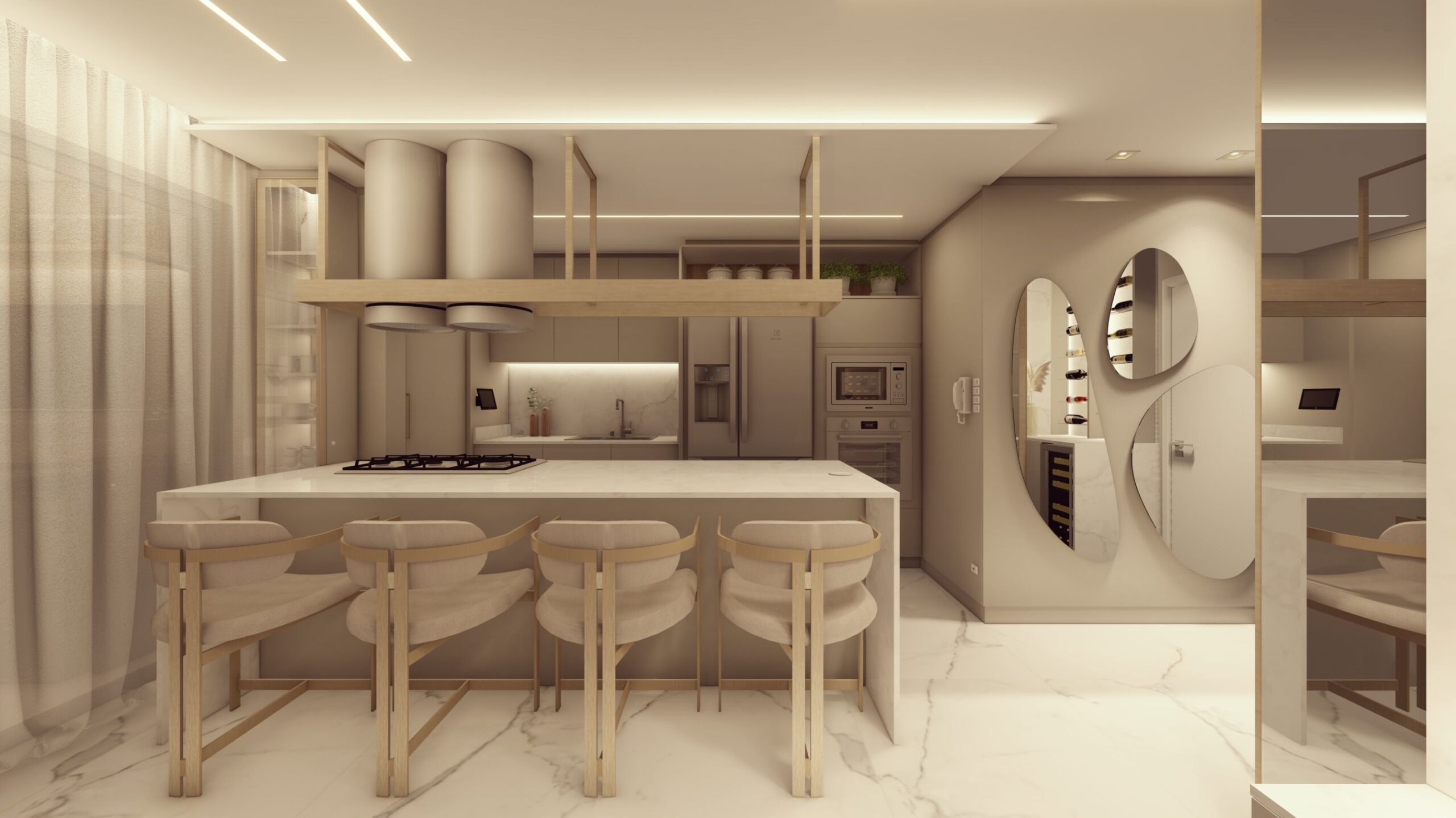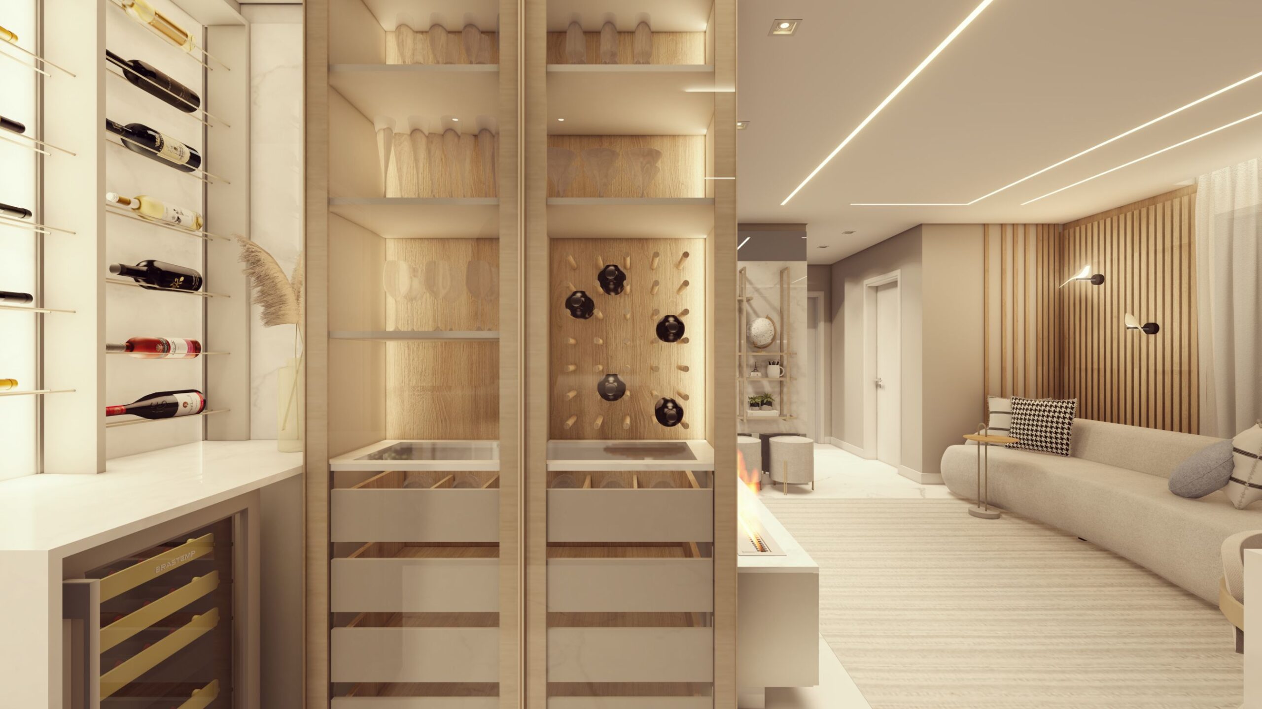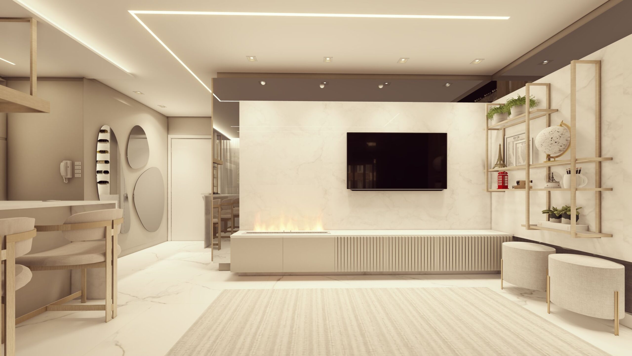 O projeto desse apartamento traz um design clean, com tons de cinza, mármore branco, e metais em champagne. Tem alguns detalhes incríveis como um espaço de adega logo na entrada, com suportes para vinhos e um armário em vidro para taças e outros, dando continuidade a adega temos um painel de tv todo em mármore, com lareira e espelho, trazendo elegância e sofisticação para o ambiente.