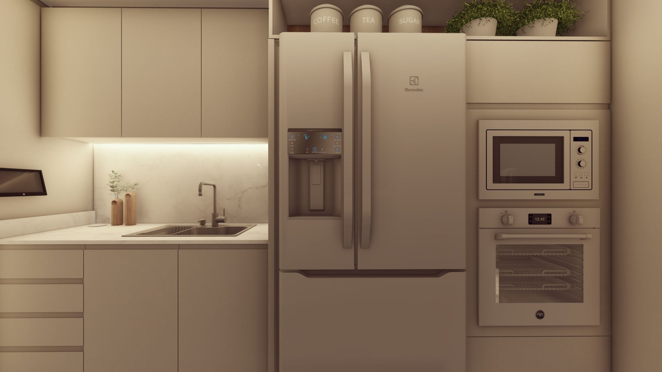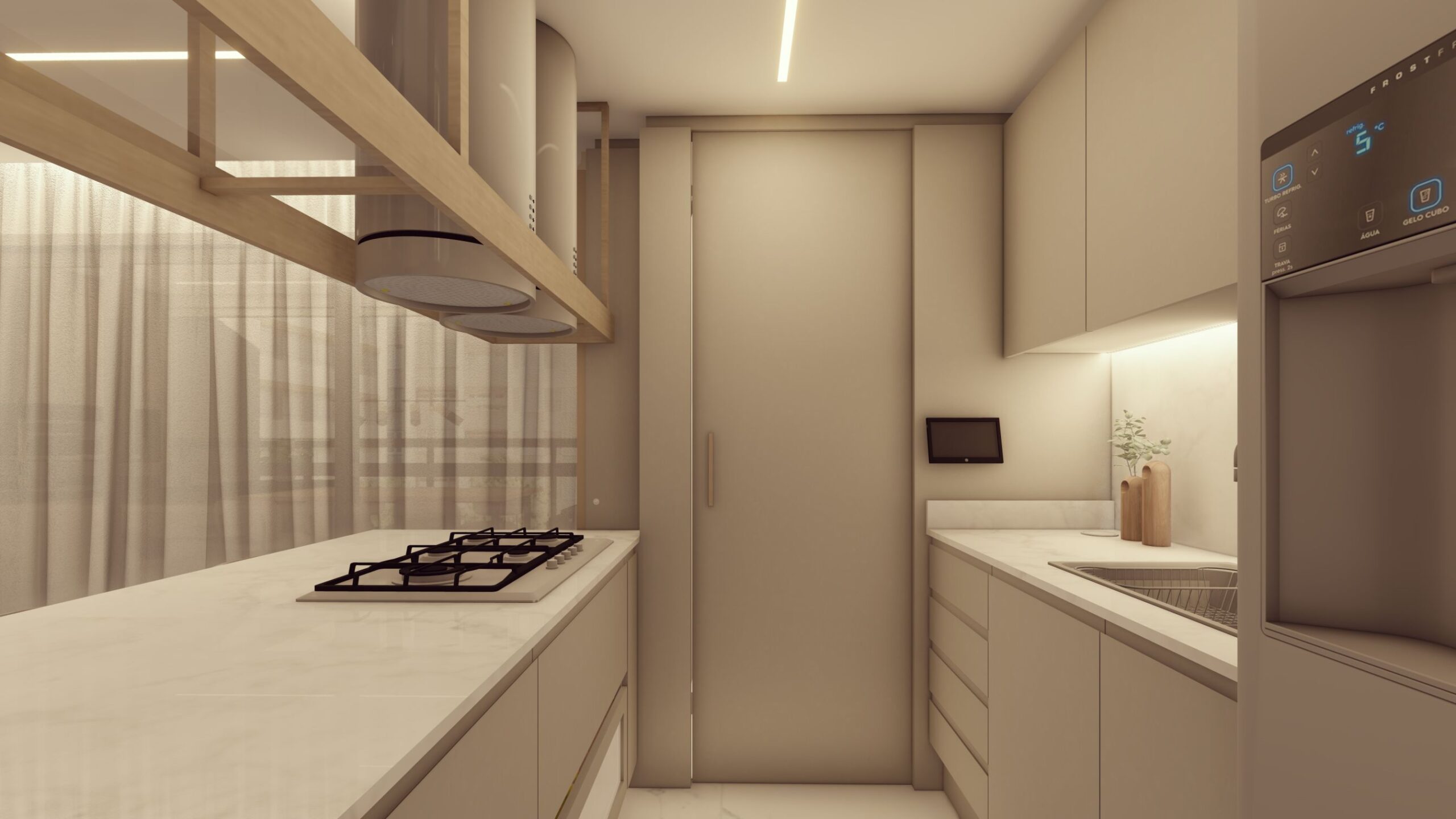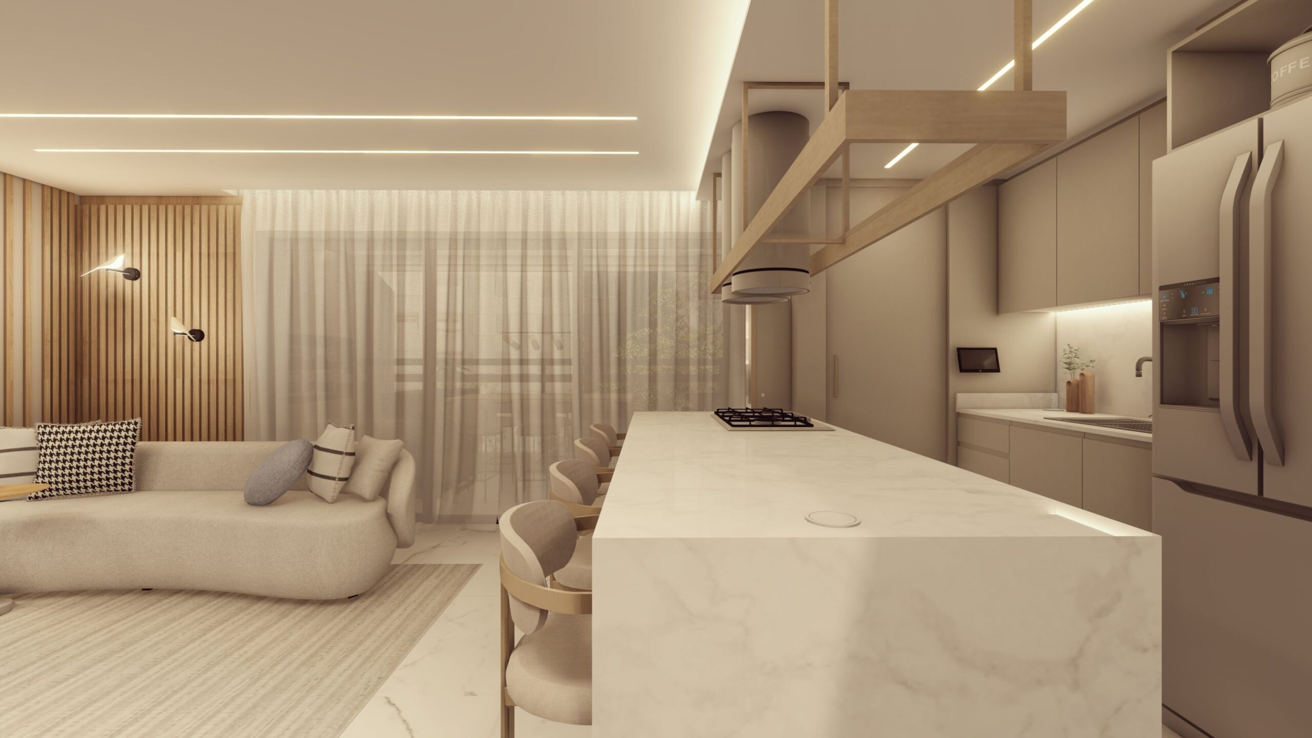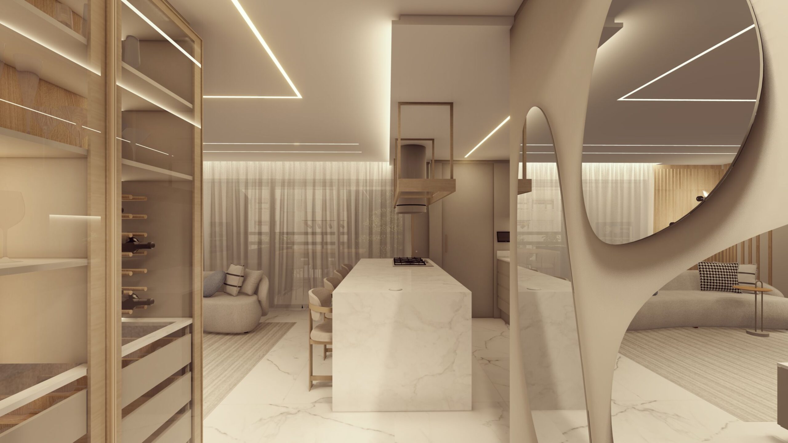 O projeto desse apartamento traz um design clean, com tons de cinza, mármore branco, e metais em champagne. Tem alguns detalhes incríveis como um espaço de adega logo na entrada, com suportes para vinhos e um armário em vidro para taças e outros, dando continuidade a adega temos um painel de tv todo em mármore, com lareira e espelho, trazendo elegância e sofisticação para o ambiente.
