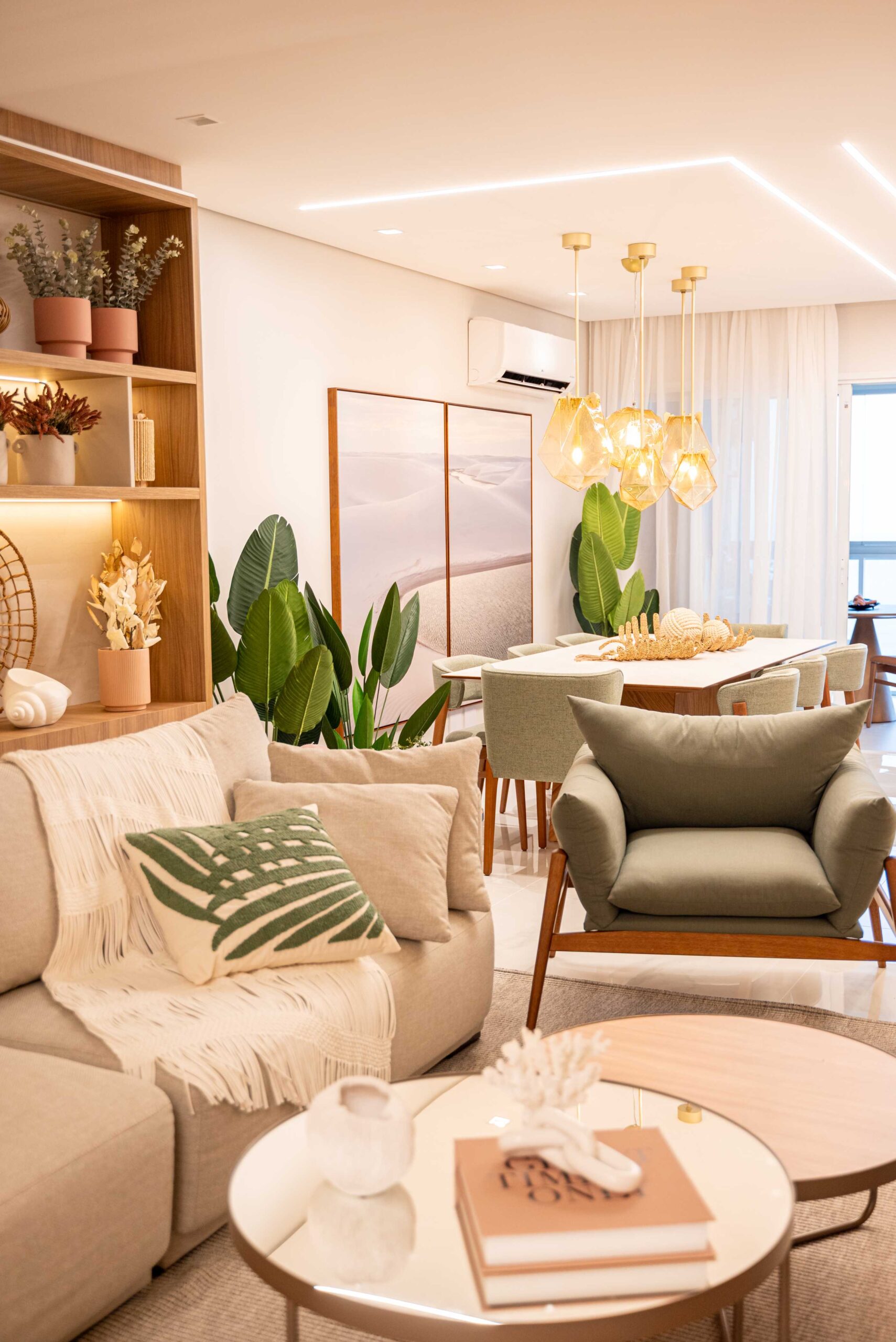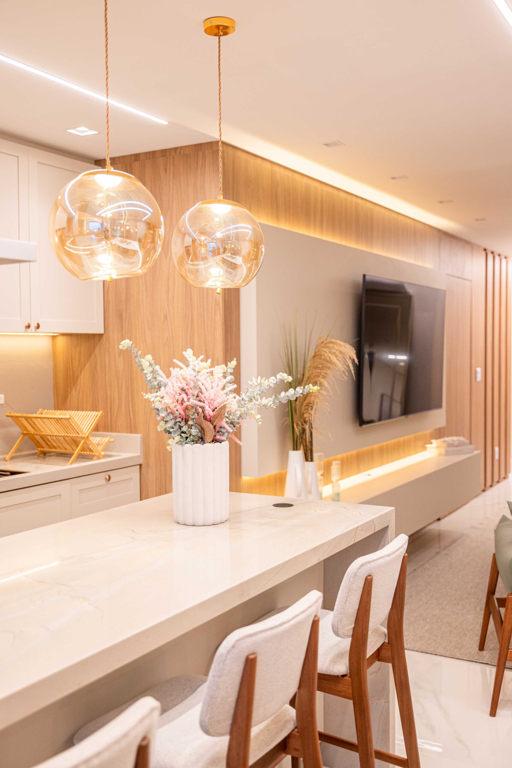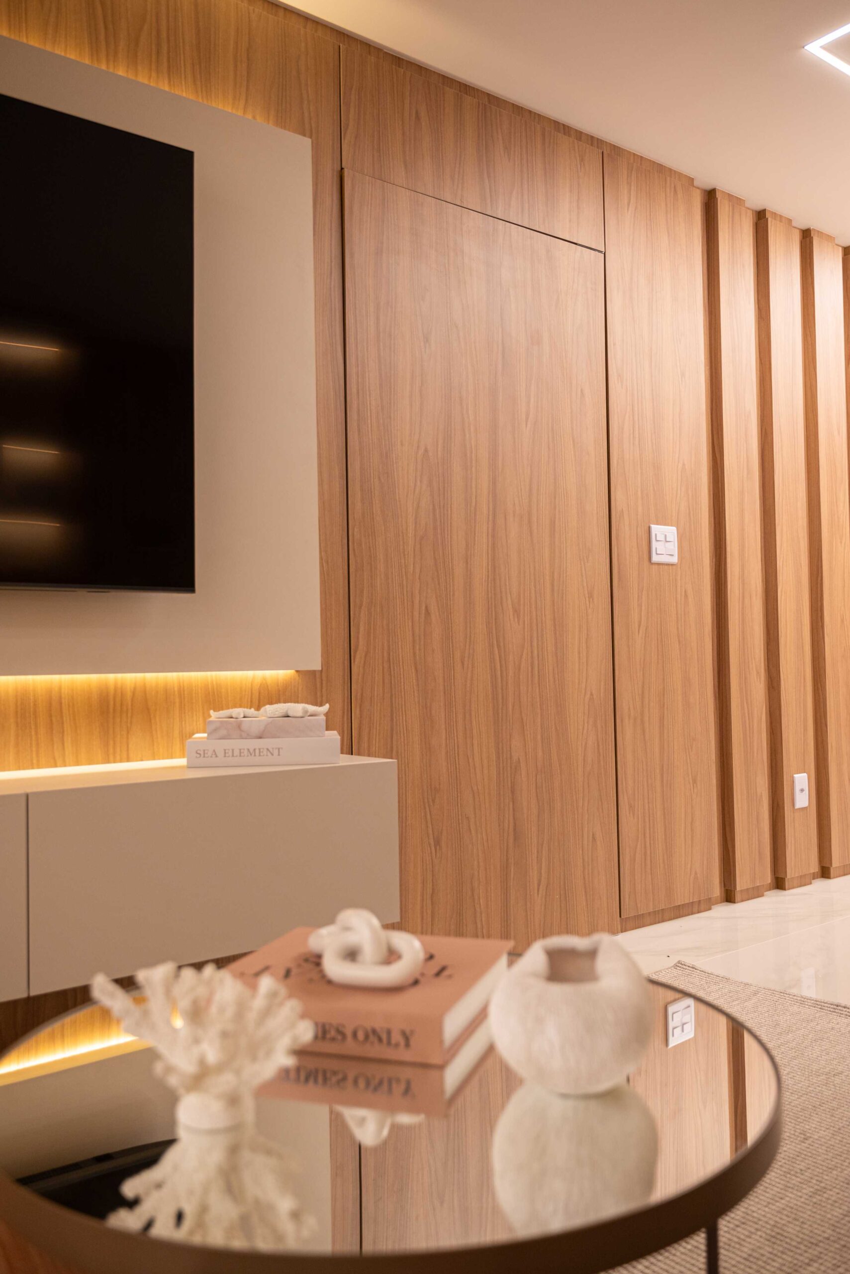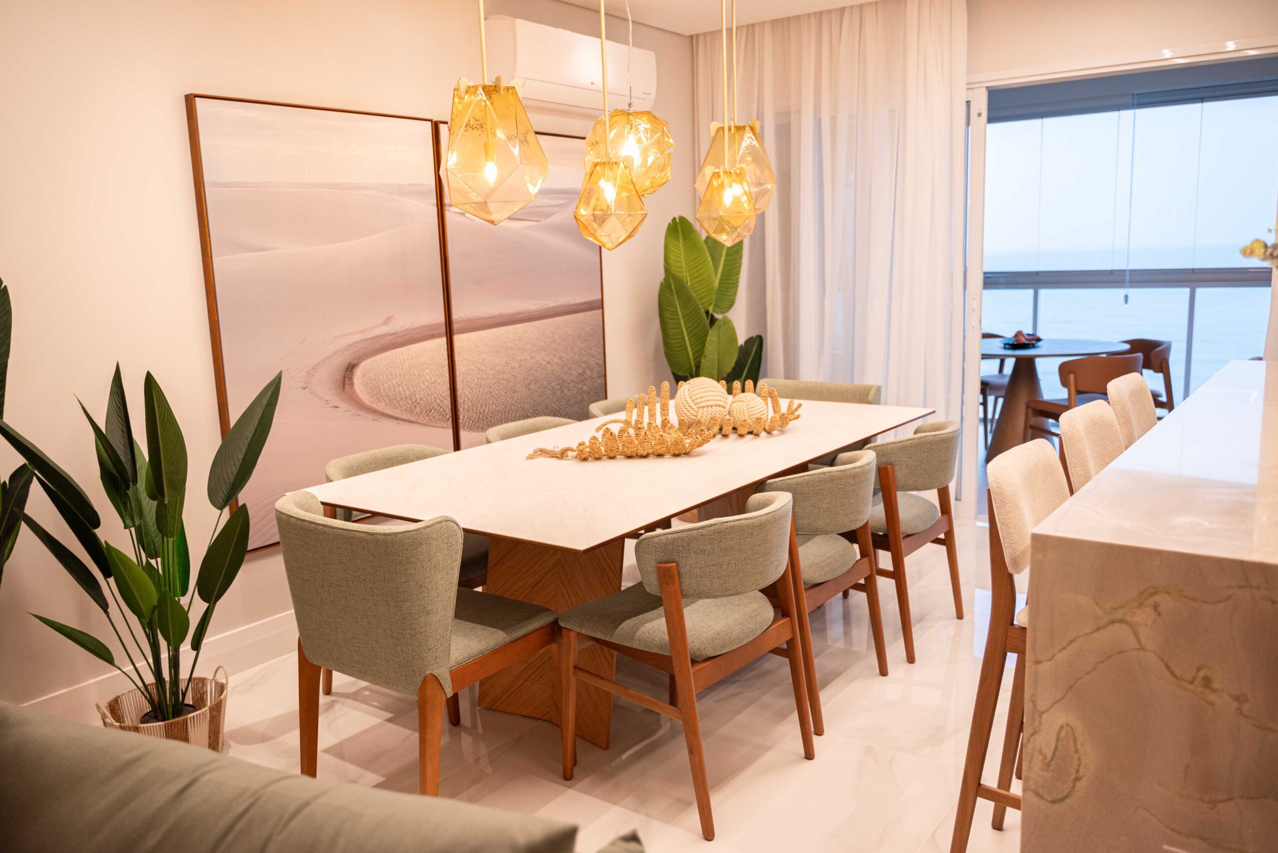 O projeto da área social deste apartamento com tons claros, mesclados com madeira, conta com algumas estratégias e soluções de projeto que tornam ele ainda mais lindo, como um painel de TV com uma porta oculta, uma estante com decorações maravilhosas com uma porta deslizante em palha indiana, que pode ser reposicionada, sempre ocultando ou exibindo novas decorações, uma cozinha no estilo provençal, com molduras nas portas e puxadores aparentes, e todo seu interno planejado. Além disso trabalhamos com cores em elementos pontuais, como cadeiras, e elementos de decorações que trazem a composição perfeita pra esse ambiente, sem falar na linda vista pro mar, que agrega ainda mais para o visual deste projeto.
