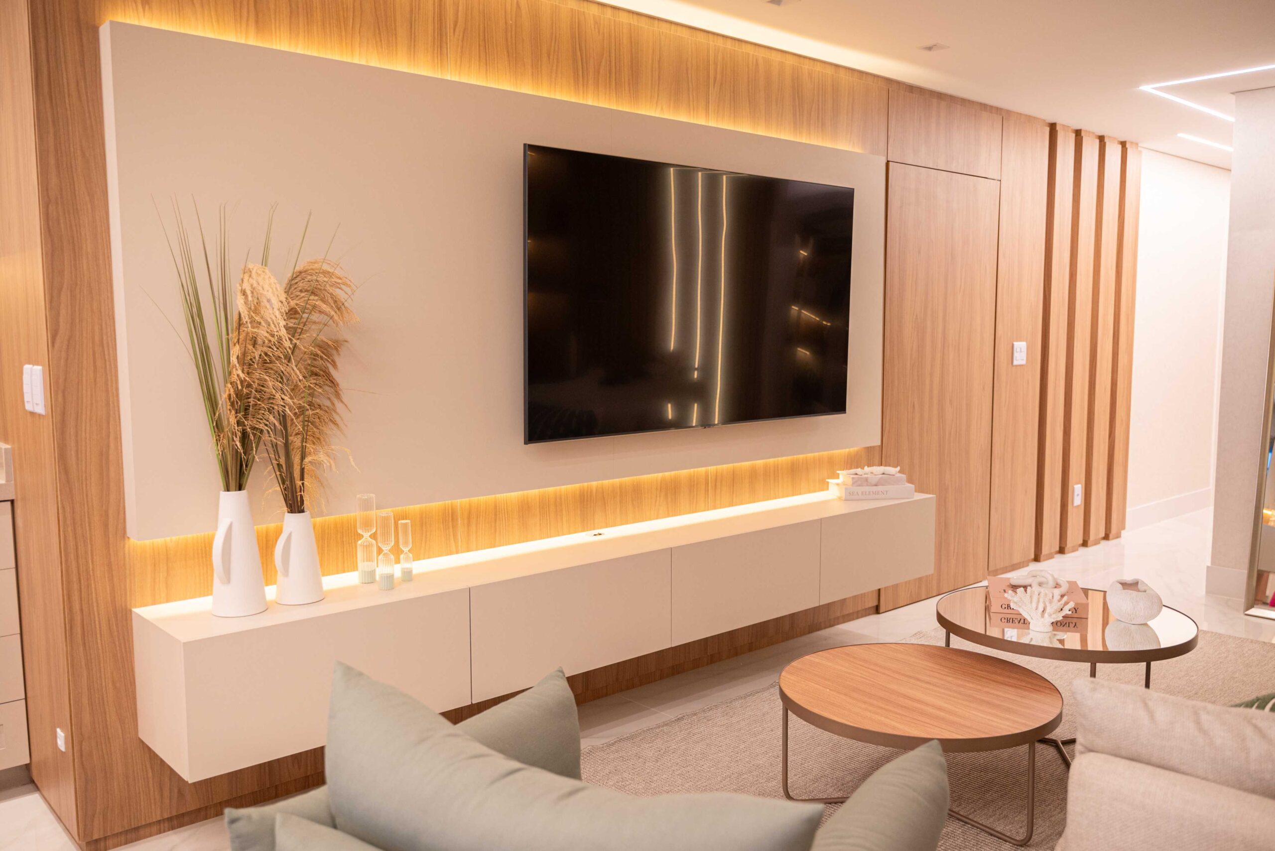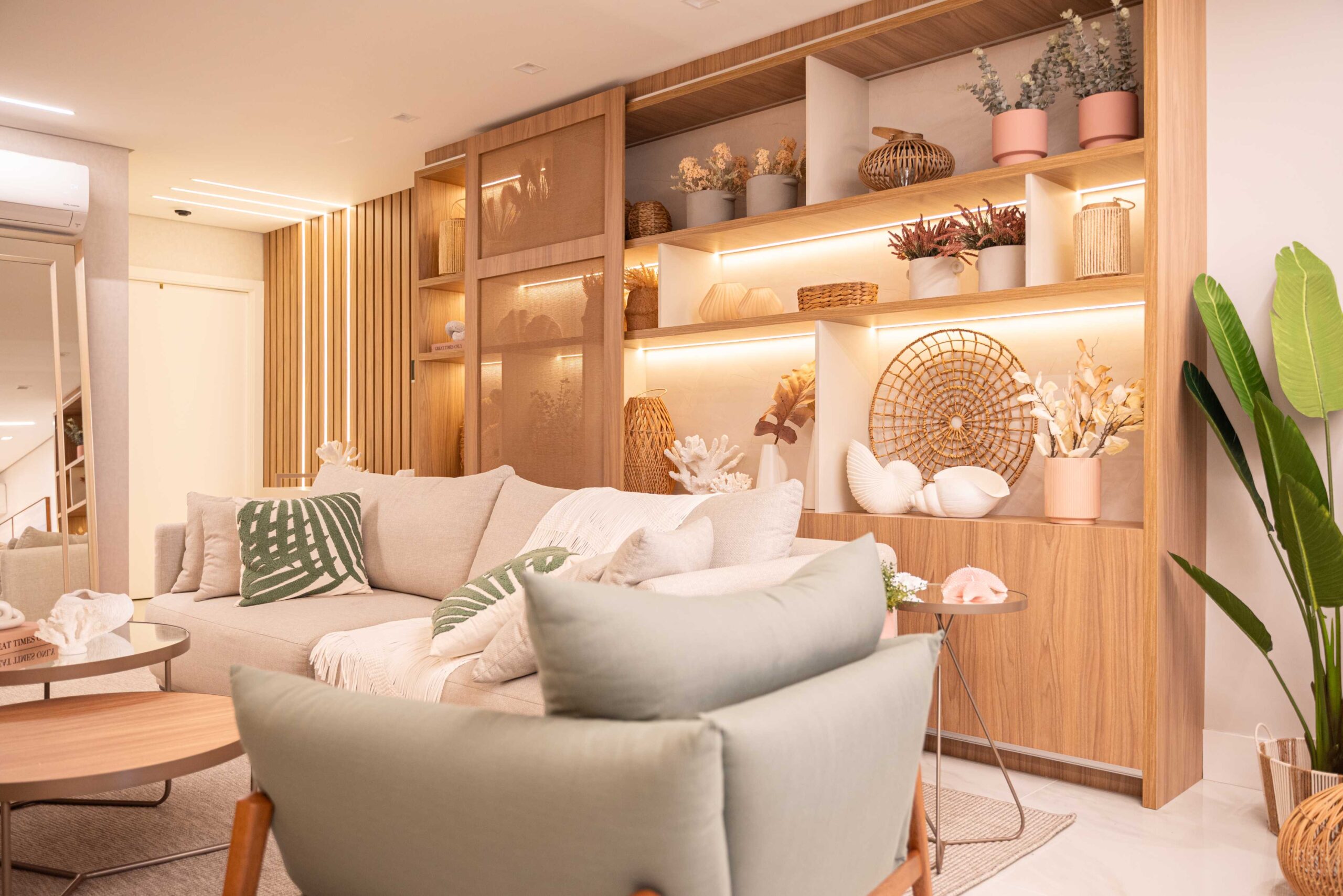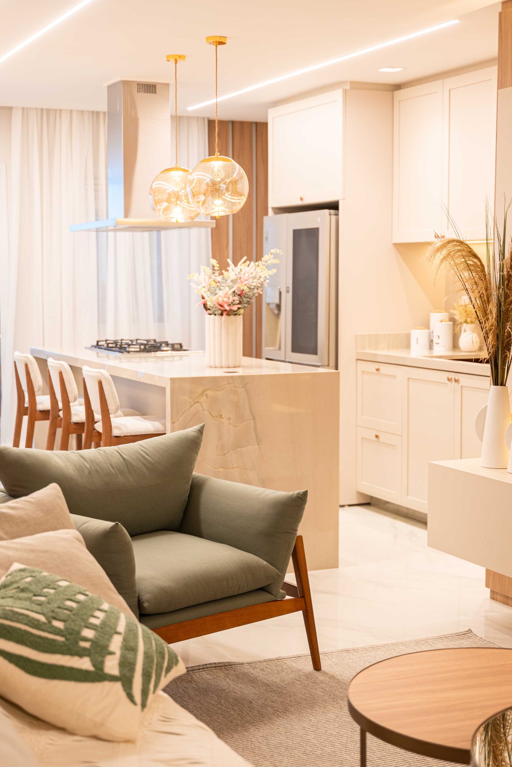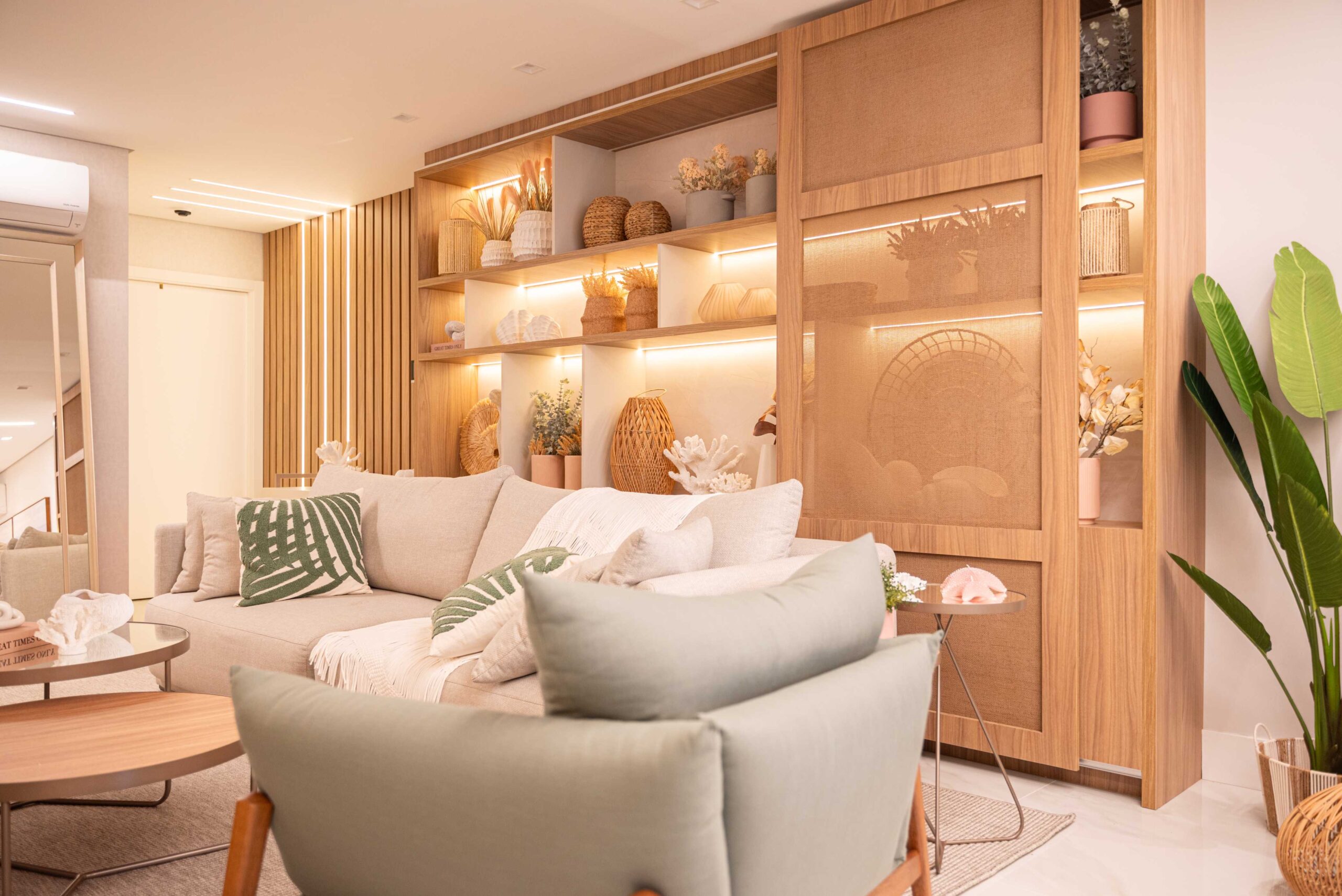 O projeto da área social deste apartamento com tons claros, mesclados com madeira, conta com algumas estratégias e soluções de projeto que tornam ele ainda mais lindo, como um painel de TV com uma porta oculta, uma estante com decorações maravilhosas com uma porta deslizante em palha indiana, que pode ser reposicionada, sempre ocultando ou exibindo novas decorações, uma cozinha no estilo provençal, com molduras nas portas e puxadores aparentes, e todo seu interno planejado. Além disso trabalhamos com cores em elementos pontuais, como cadeiras, e elementos de decorações que trazem a composição perfeita pra esse ambiente, sem falar na linda vista pro mar, que agrega ainda mais para o visual deste projeto.