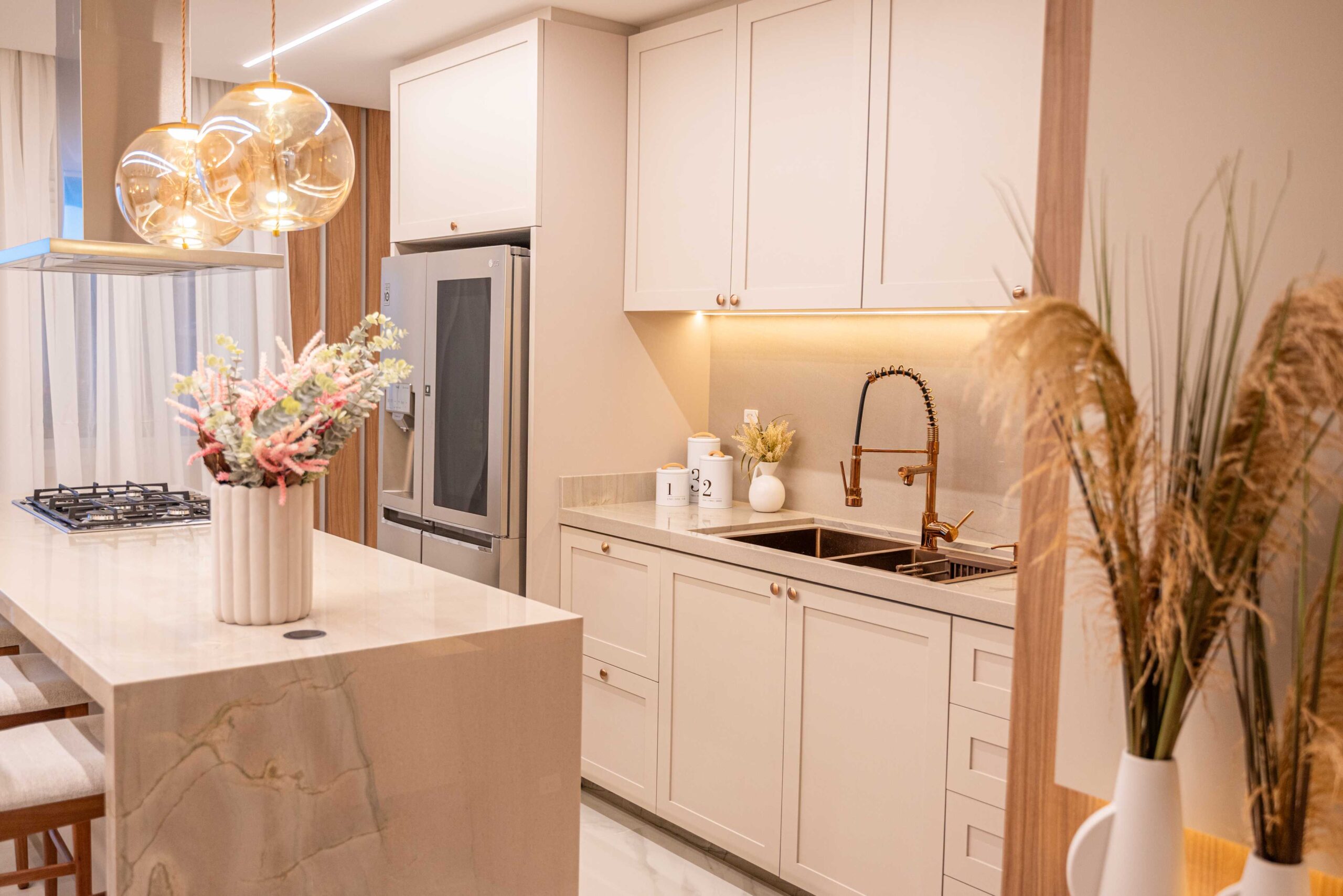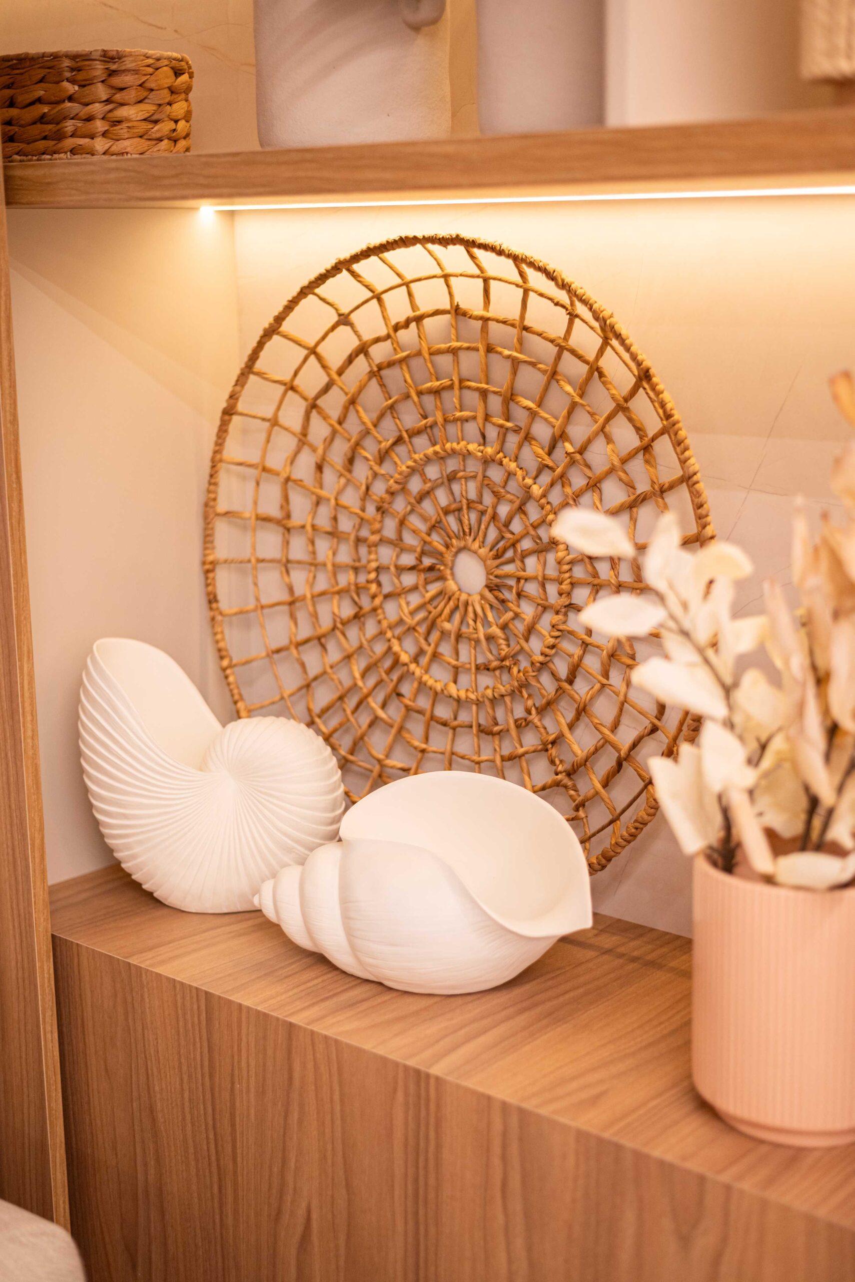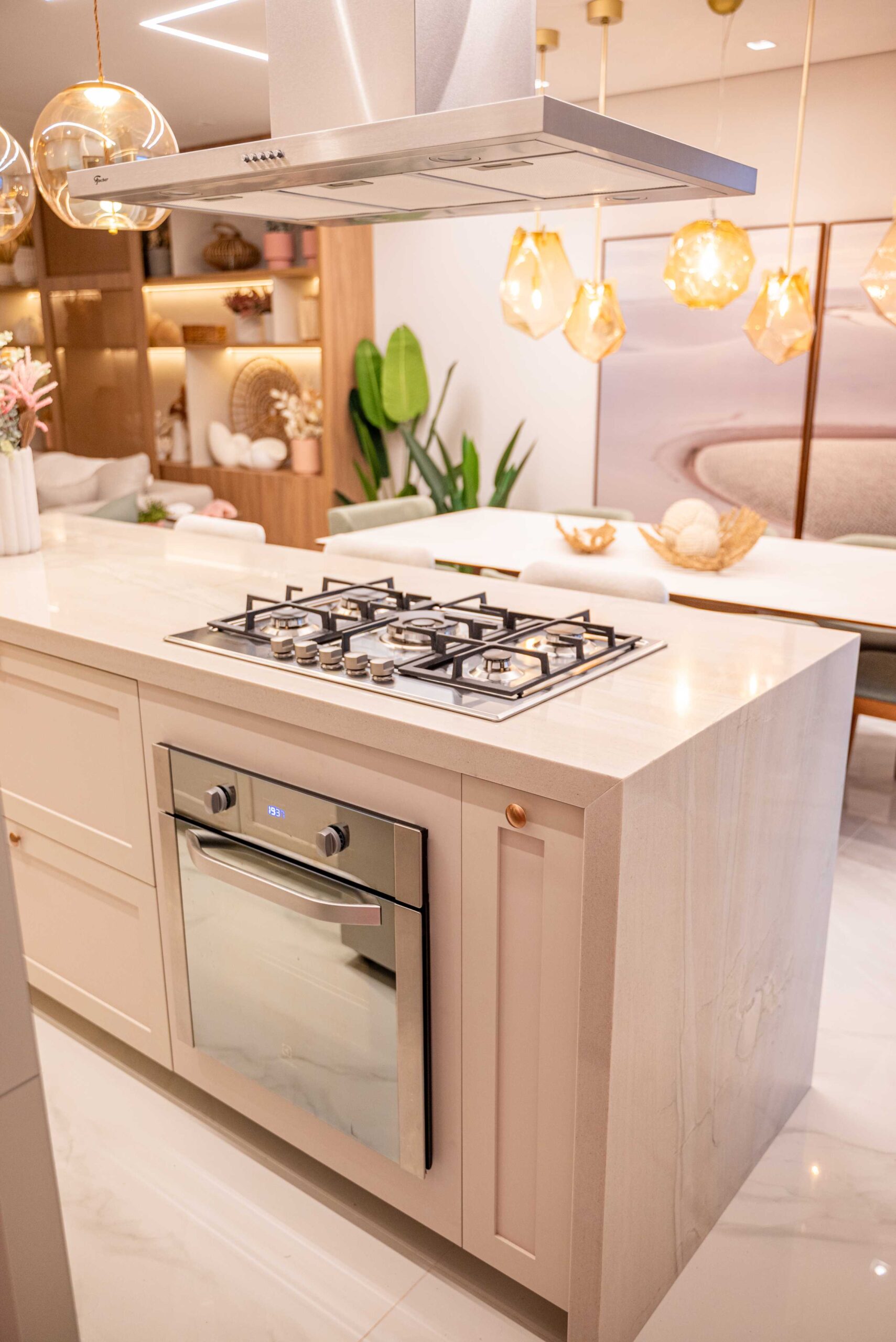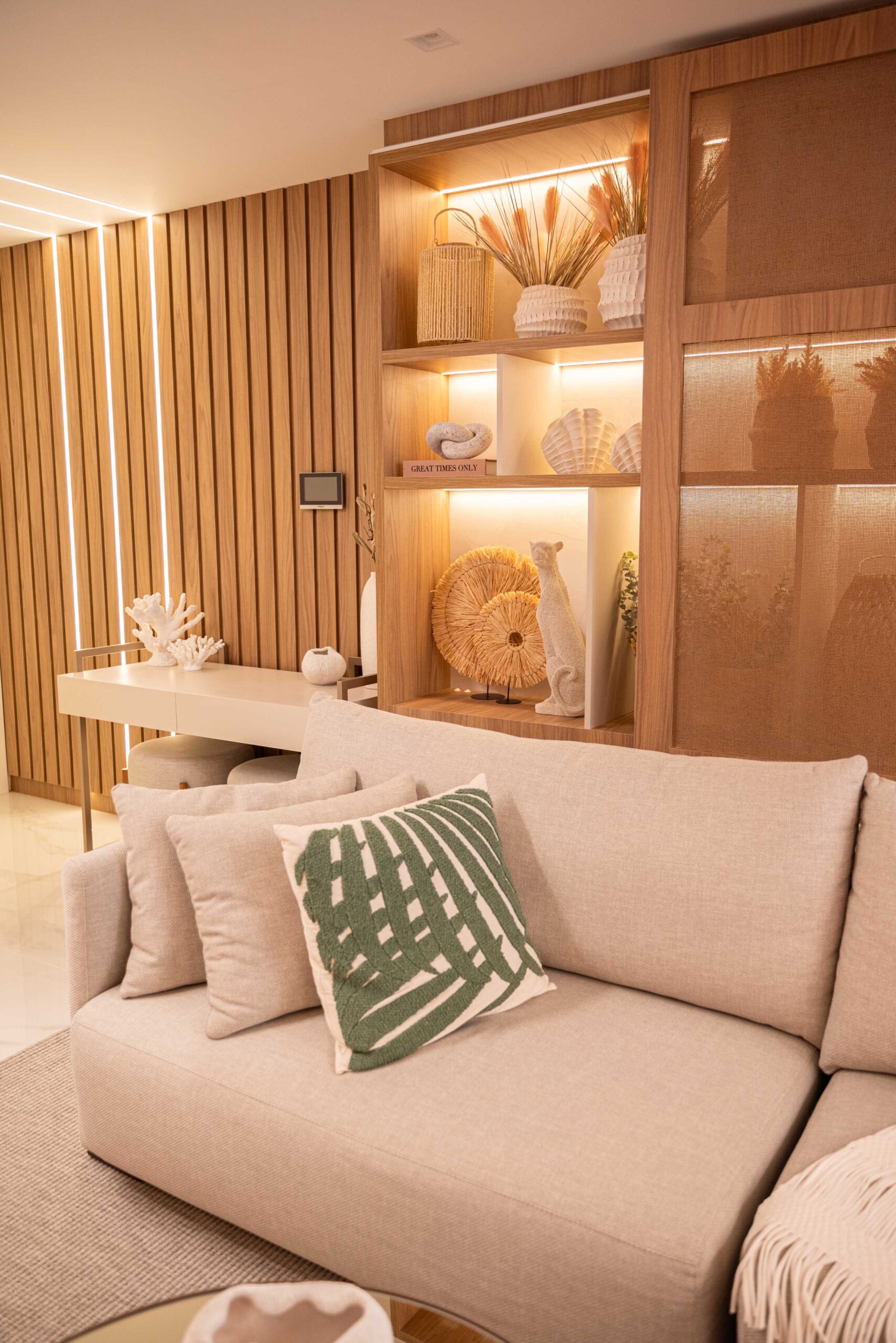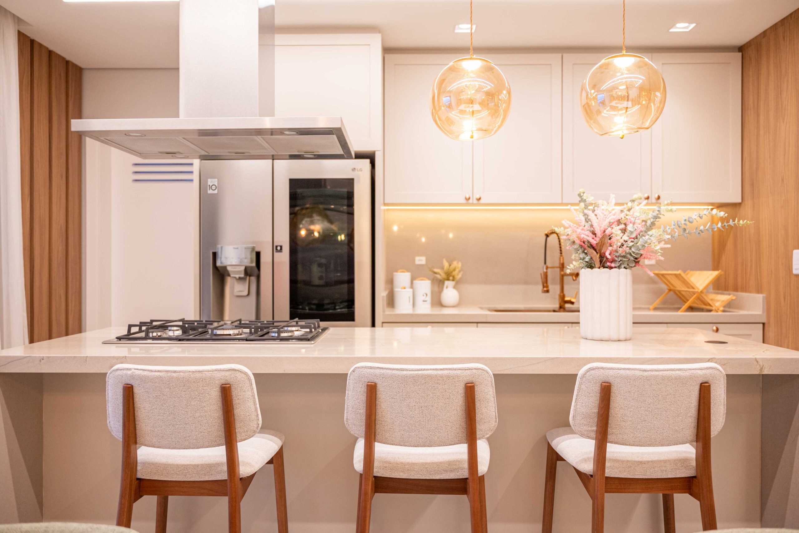 O projeto da área social deste apartamento com tons claros, mesclados com madeira, conta com algumas estratégias e soluções de projeto que tornam ele ainda mais lindo, como um painel de TV com uma porta oculta, uma estante com decorações maravilhosas com uma porta deslizante em palha indiana, que pode ser reposicionada, sempre ocultando ou exibindo novas decorações, uma cozinha no estilo provençal, com molduras nas portas e puxadores aparentes, e todo seu interno planejado. Além disso trabalhamos com cores em elementos pontuais, como cadeiras, e elementos de decorações que trazem a composição perfeita pra esse ambiente, sem falar na linda vista pro mar, que agrega ainda mais para o visual deste projeto.