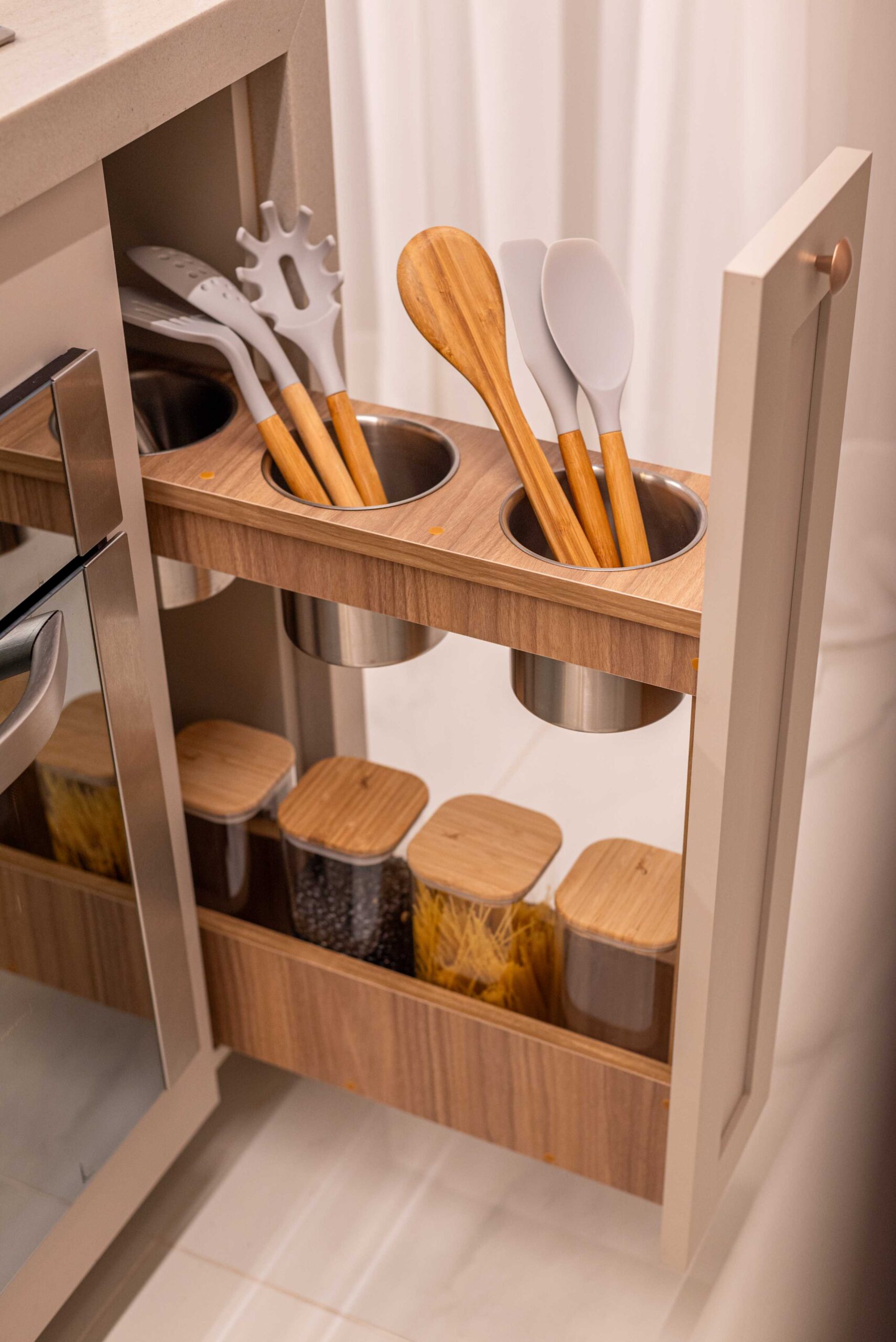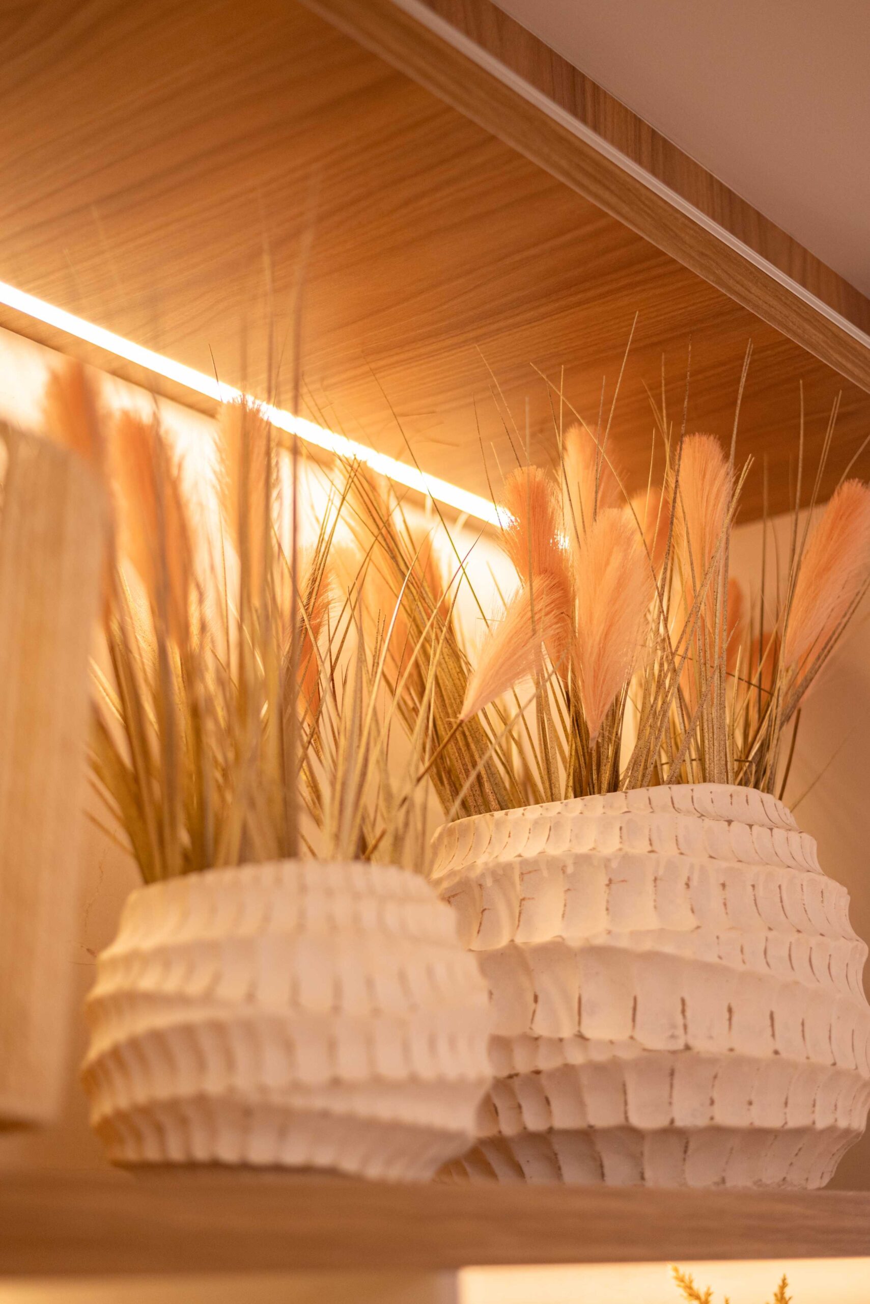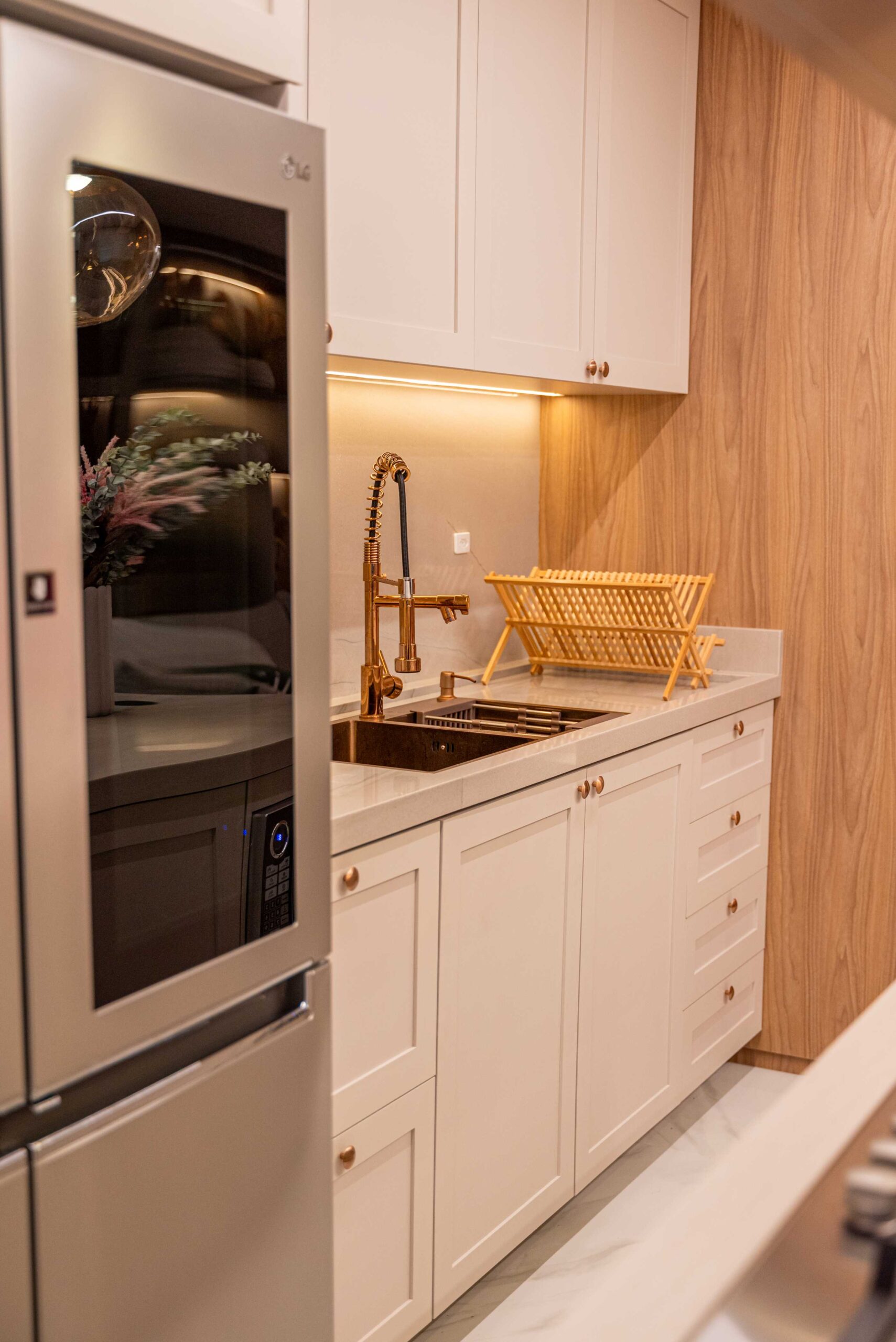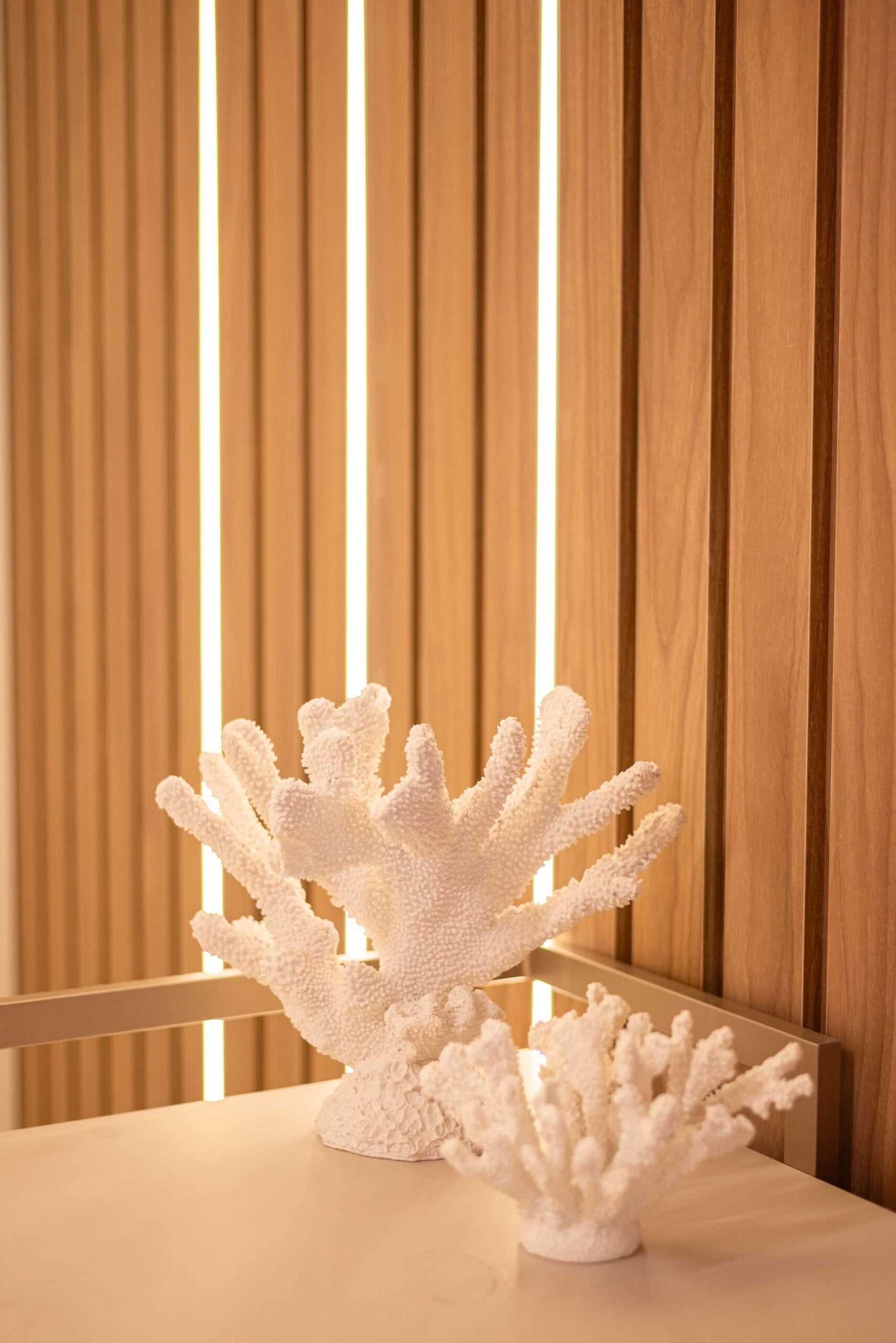 O projeto da área social deste apartamento com tons claros, mesclados com madeira, conta com algumas estratégias e soluções de projeto que tornam ele ainda mais lindo, como um painel de TV com uma porta oculta, uma estante com decorações maravilhosas com uma porta deslizante em palha indiana, que pode ser reposicionada, sempre ocultando ou exibindo novas decorações, uma cozinha no estilo provençal, com molduras nas portas e puxadores aparentes, e todo seu interno planejado. Além disso trabalhamos com cores em elementos pontuais, como cadeiras, e elementos de decorações que trazem a composição perfeita pra esse ambiente, sem falar na linda vista pro mar, que agrega ainda mais para o visual deste projeto.