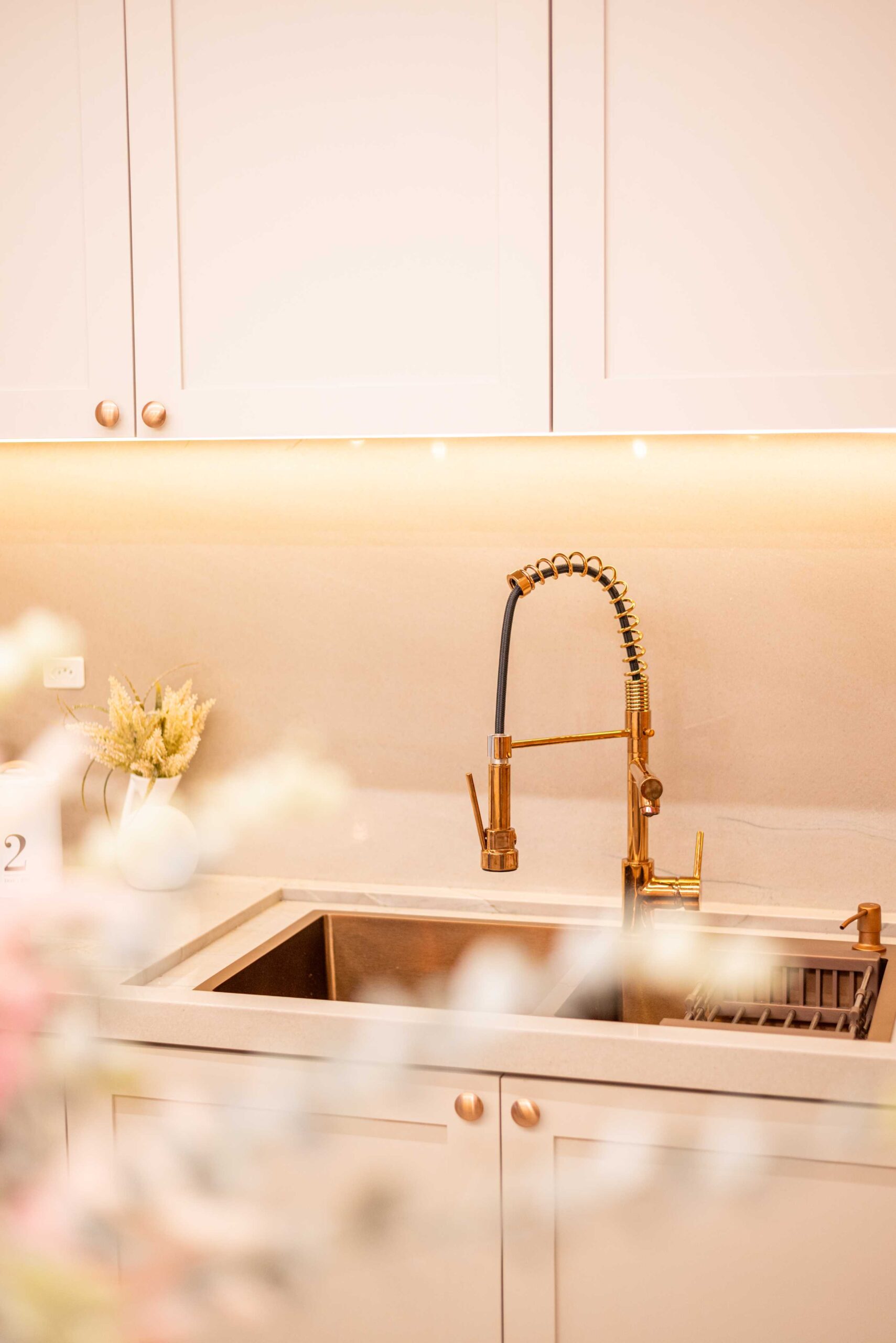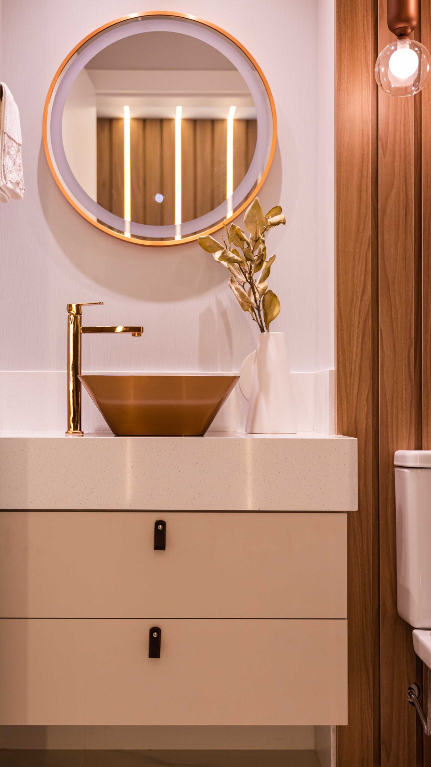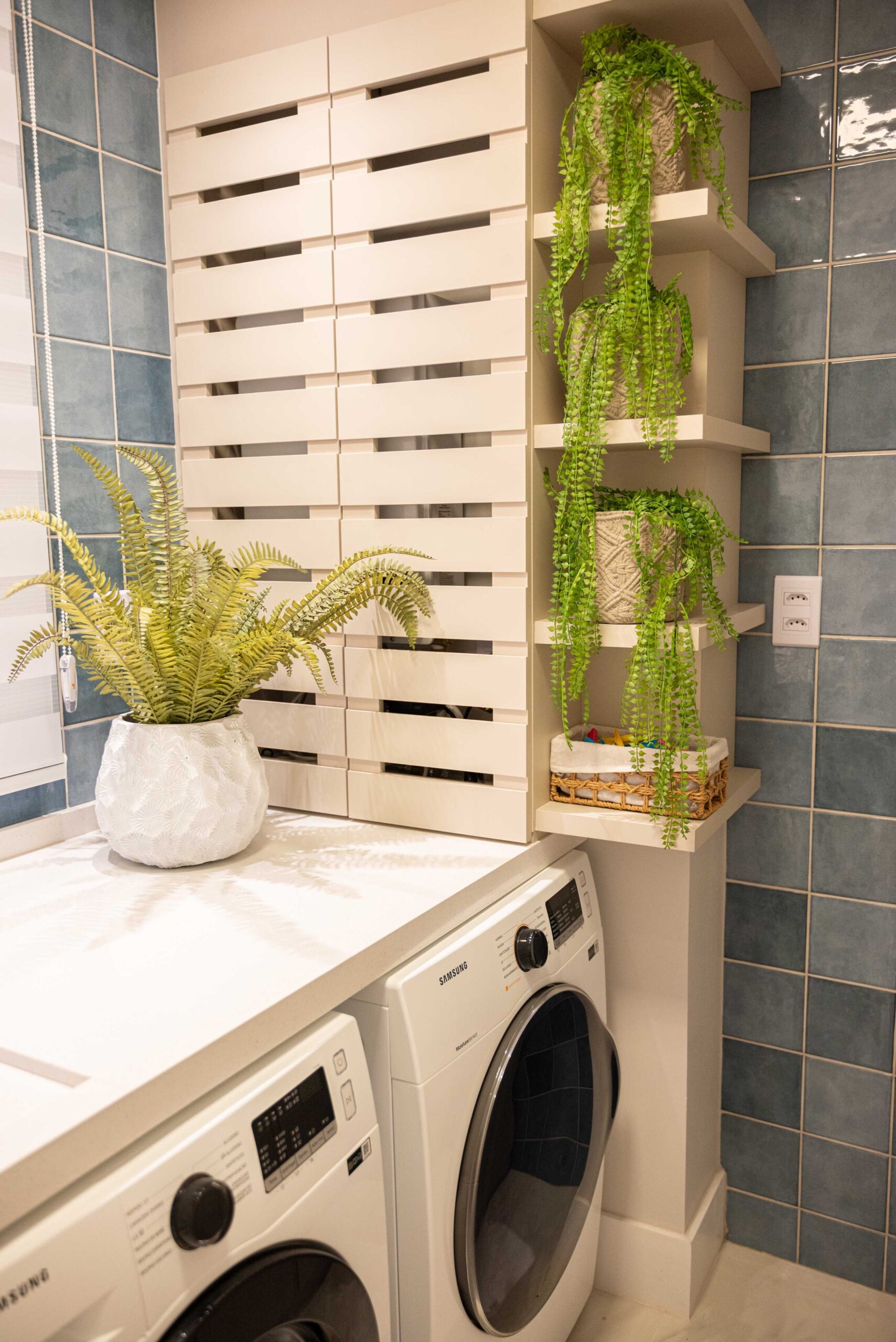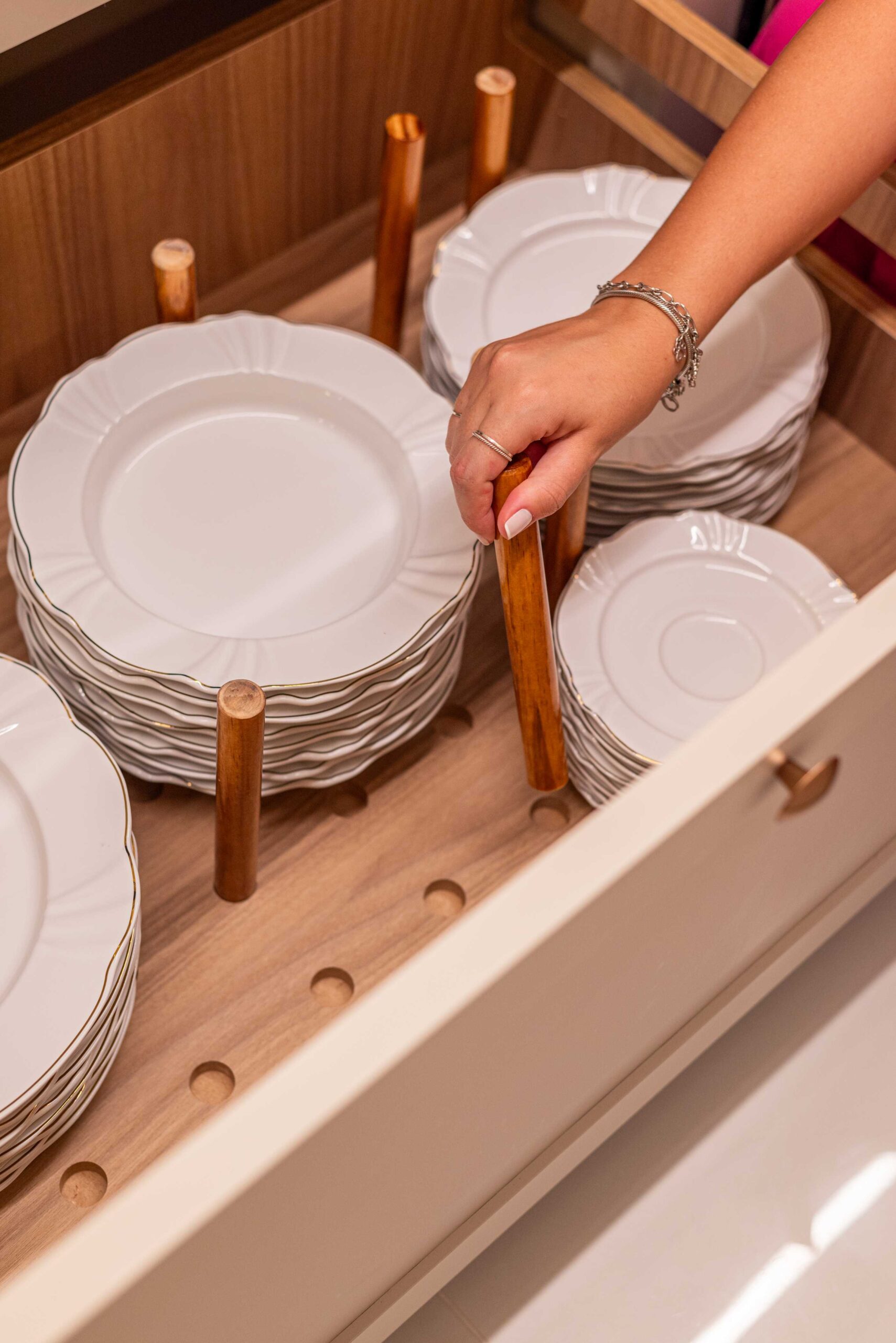 O projeto da área social deste apartamento com tons claros, mesclados com madeira, conta com algumas estratégias e soluções de projeto que tornam ele ainda mais lindo, como um painel de TV com uma porta oculta, uma estante com decorações maravilhosas com uma porta deslizante em palha indiana, que pode ser reposicionada, sempre ocultando ou exibindo novas decorações, uma cozinha no estilo provençal, com molduras nas portas e puxadores aparentes, e todo seu interno planejado. Além disso trabalhamos com cores em elementos pontuais, como cadeiras, e elementos de decorações que trazem a composição perfeita pra esse ambiente, sem falar na linda vista pro mar, que agrega ainda mais para o visual deste projeto.