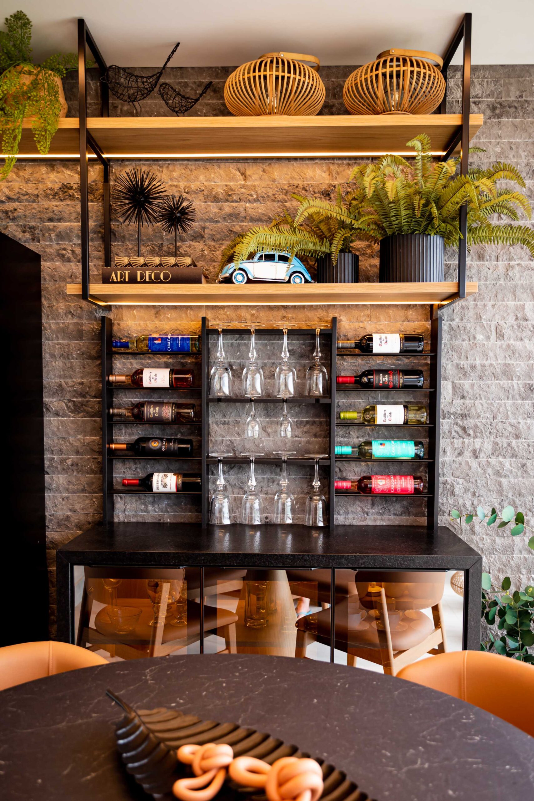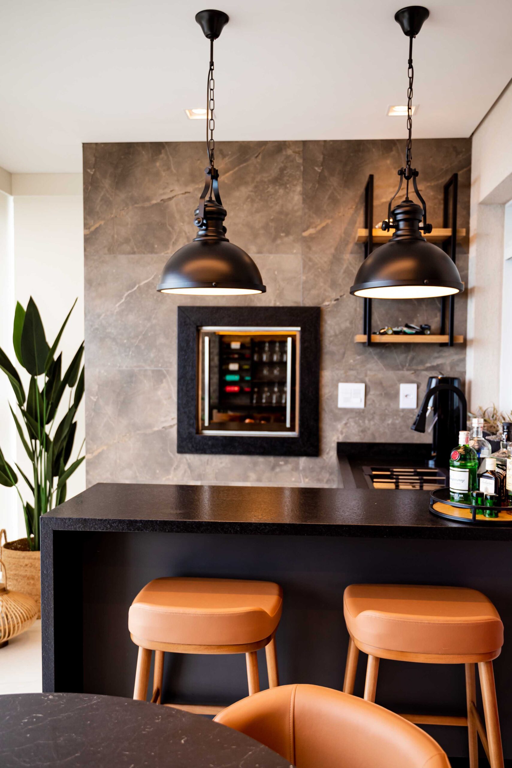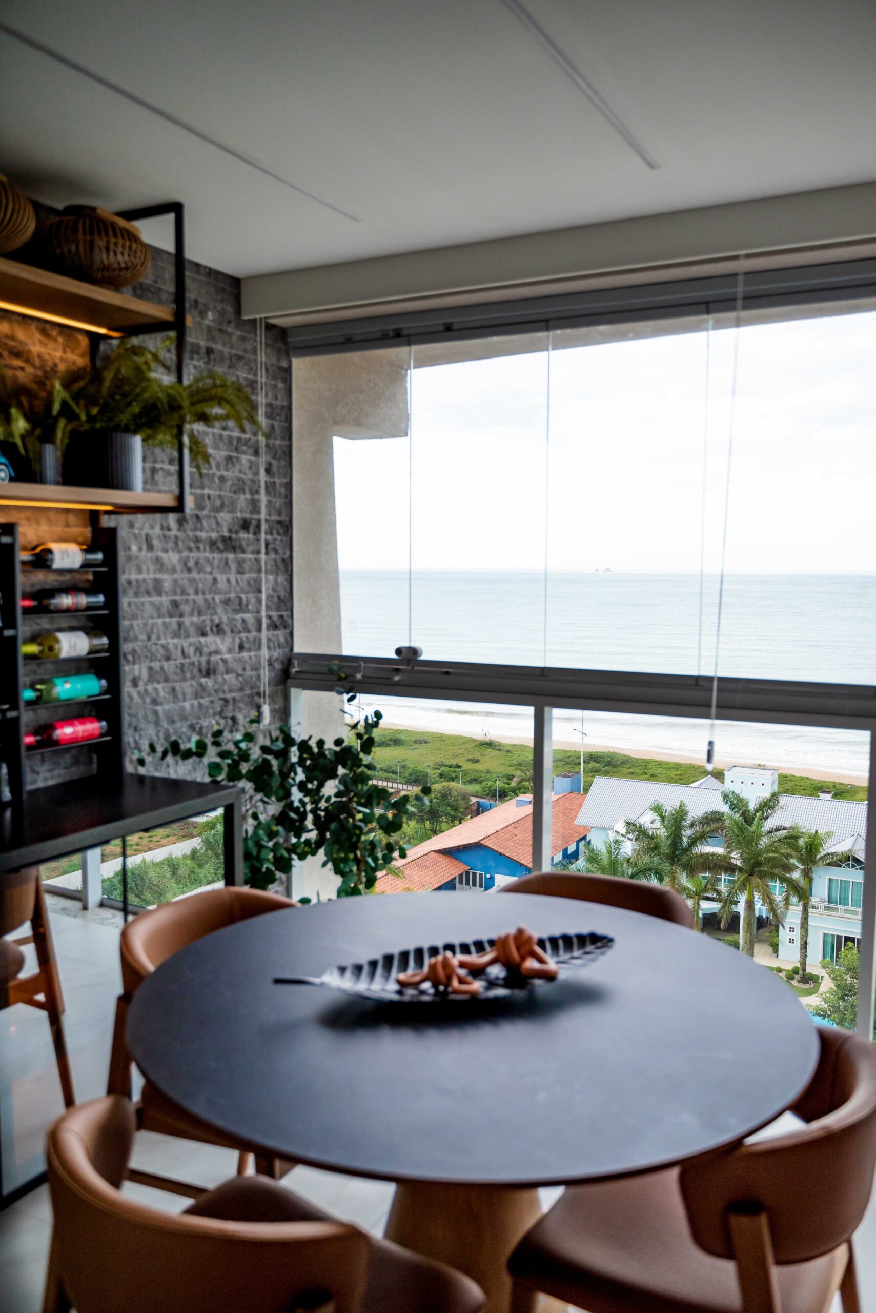 No projeto dessa linda área gourmet beira mar, trabalhamos com tons de cinza e preto, com as cadeiras e banquetas em couro trazendo o contraste ideal para o ambiente, além um lindo revestimento em relevo na parede para dar destaque, e a pedra dos tampos em acabamento escovado, que trás sofisticação para o ambiente. O projeto também conta com uma cervejeira vertical, e um espaço todo planejado para bebidas, com suportes para taças, vinhos, e uma cristaleira inferior iluminada.