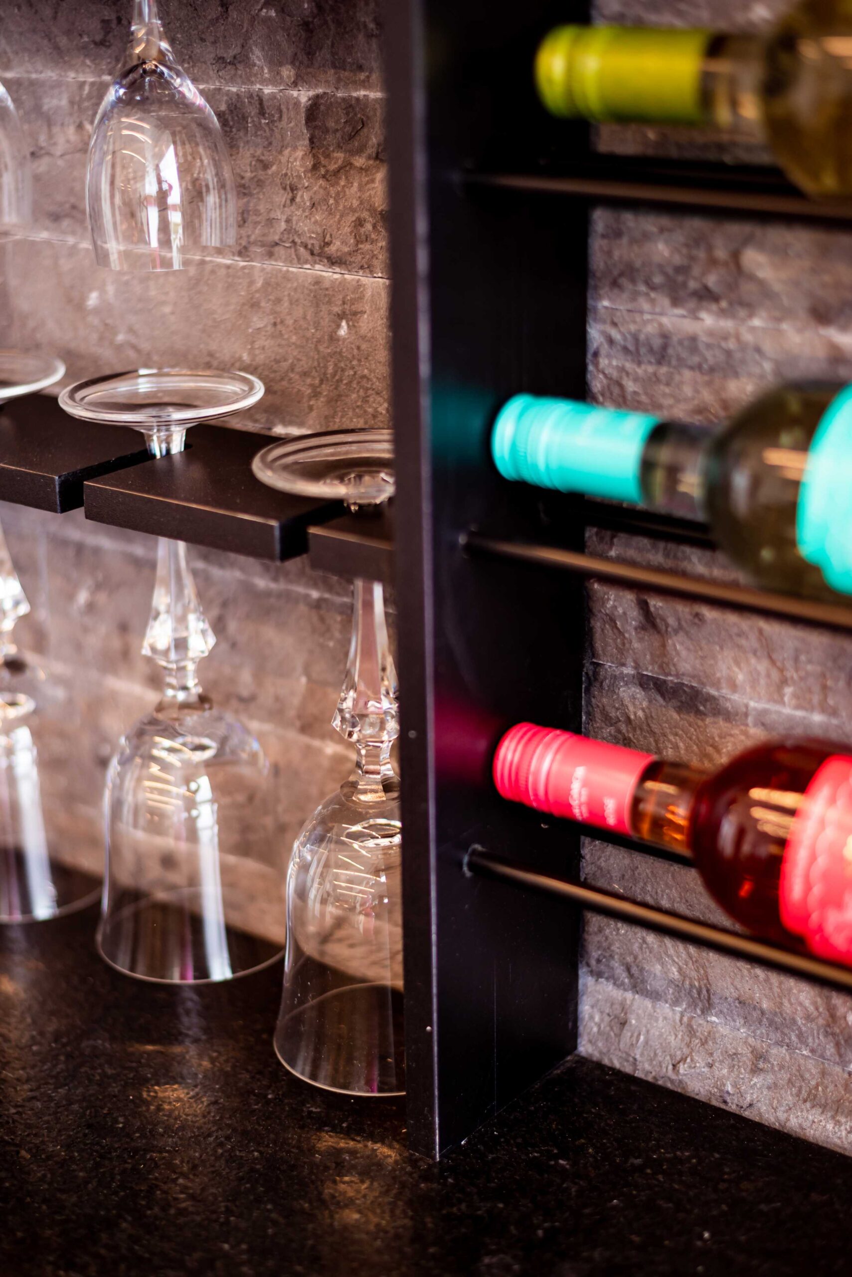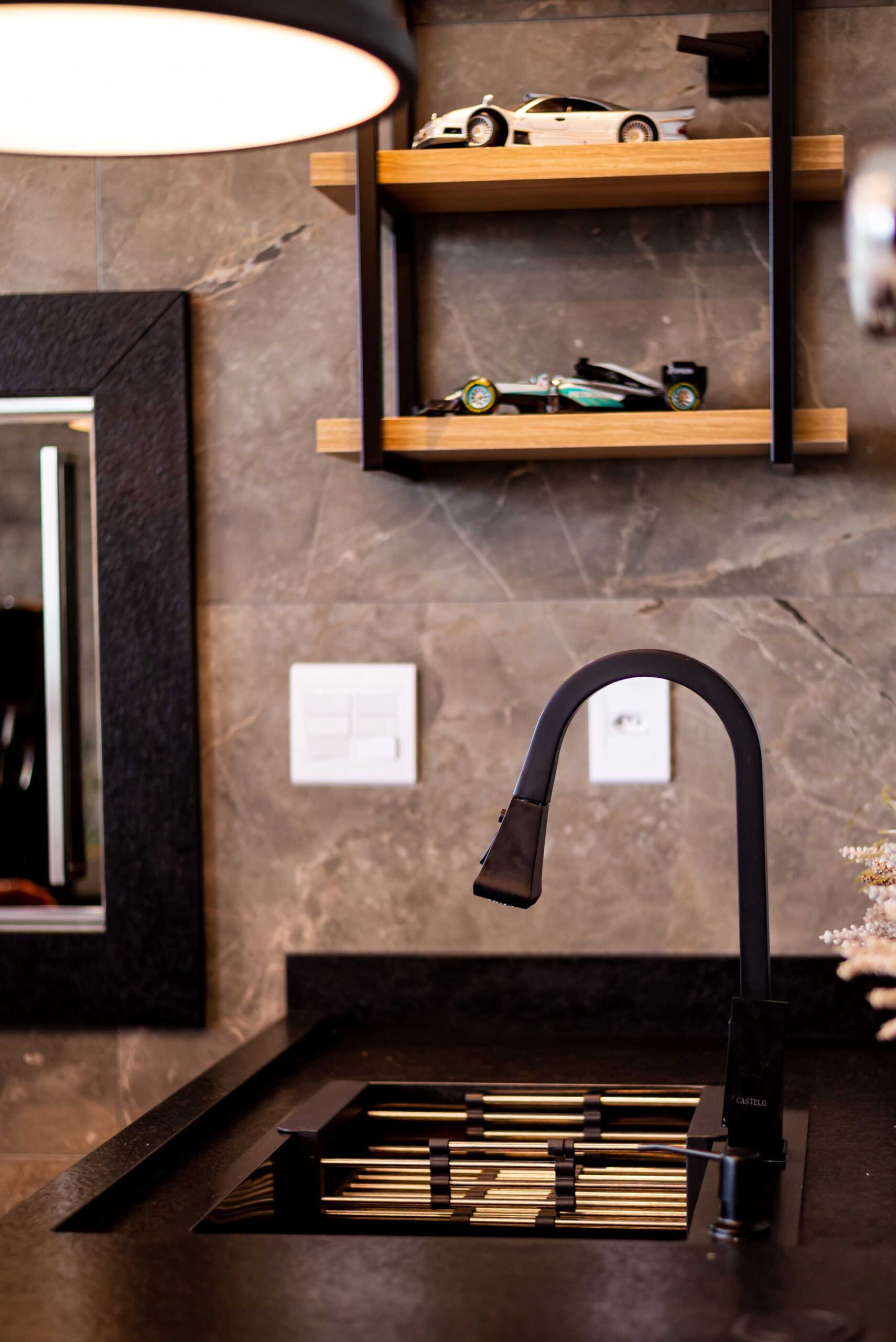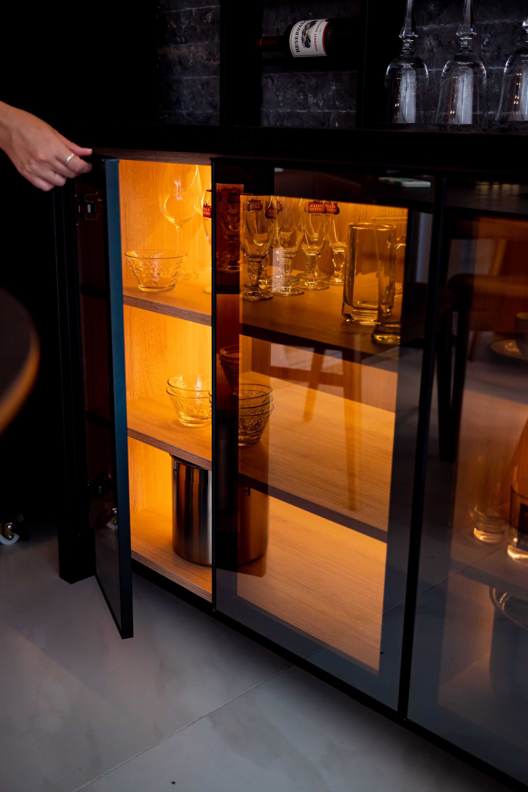 No projeto dessa linda área gourmet beira mar, trabalhamos com tons de cinza e preto, com as cadeiras e banquetas em couro trazendo o contraste ideal para o ambiente, além um lindo revestimento em relevo na parede para dar destaque, e a pedra dos tampos em acabamento escovado, que trás sofisticação para o ambiente. O projeto também conta com uma cervejeira vertical, e um espaço todo planejado para bebidas, com suportes para taças, vinhos, e uma cristaleira inferior iluminada.