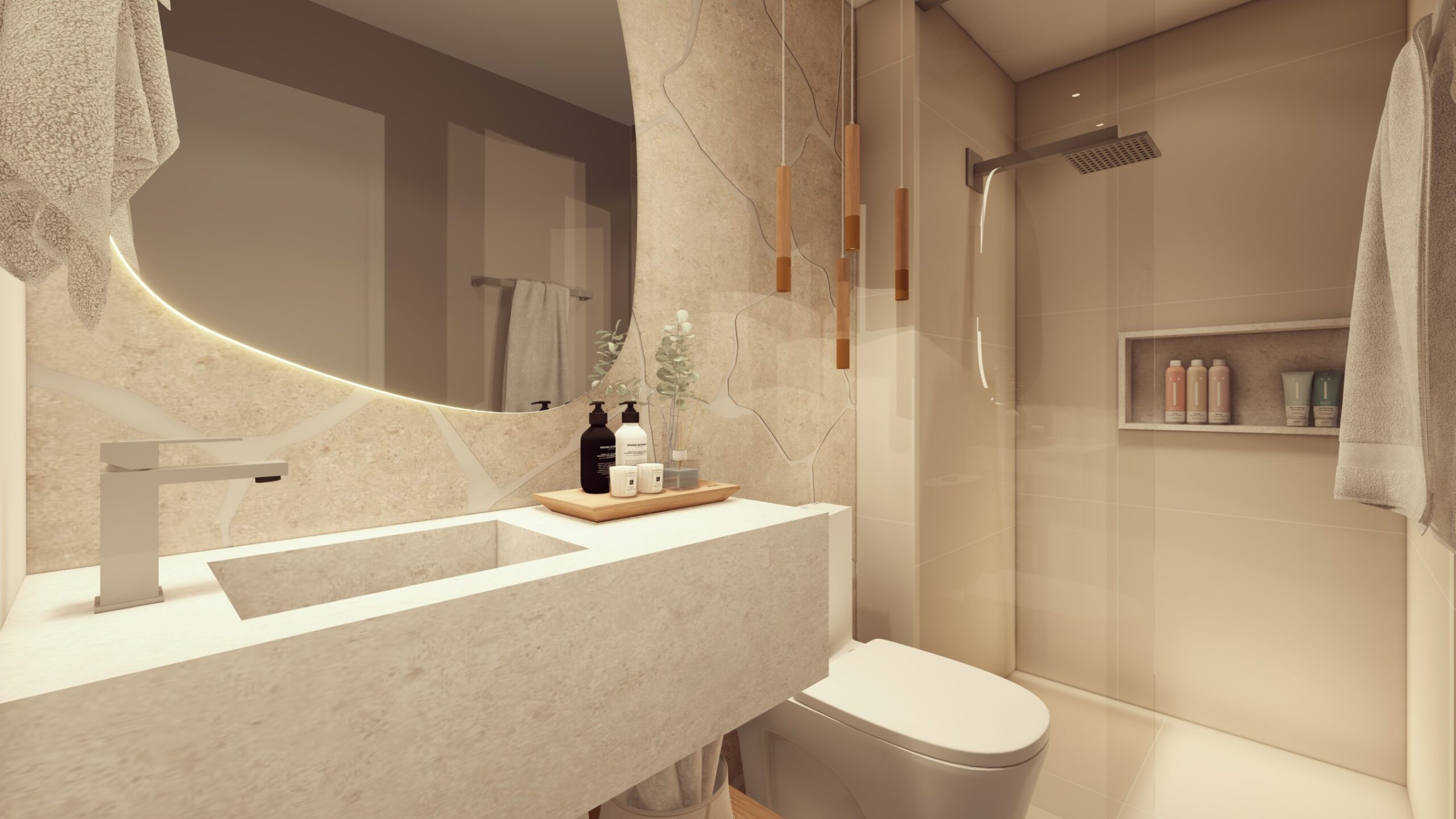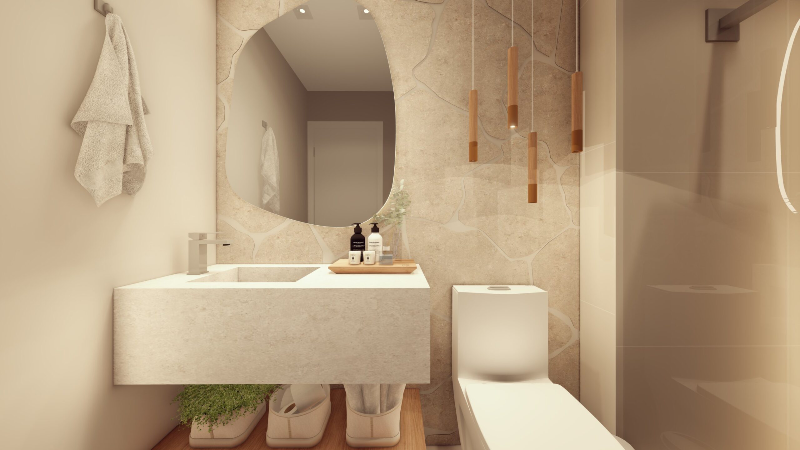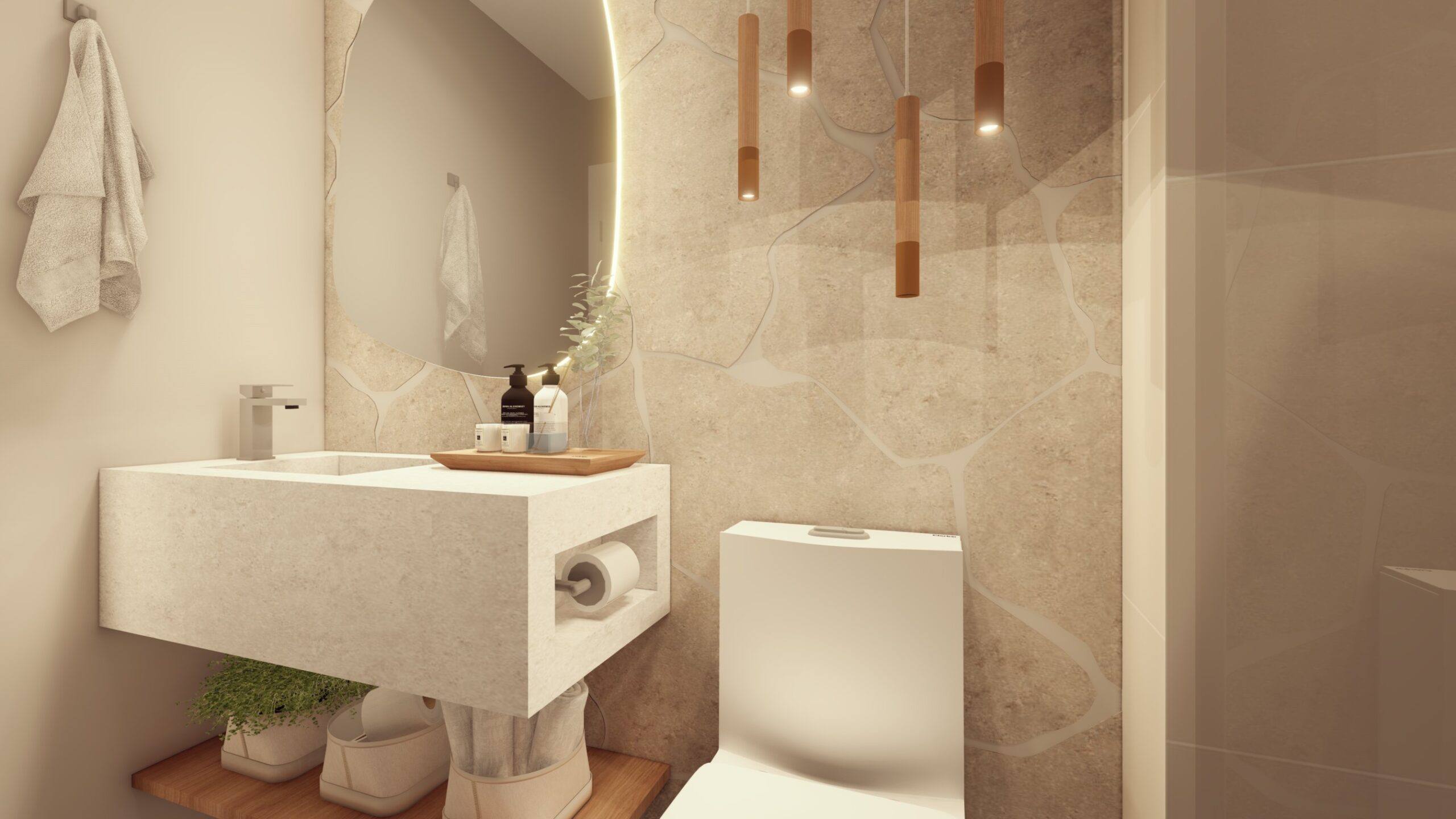 BANHEIRO ORGANICO Esse é o projeto de um lindo banheiro social, com revestimentos irregulares e fora do convencional, com uma cuba esculpida em pedra, e pendentes com detalhes em madeira que trazem o charme necessário para o ambiente.