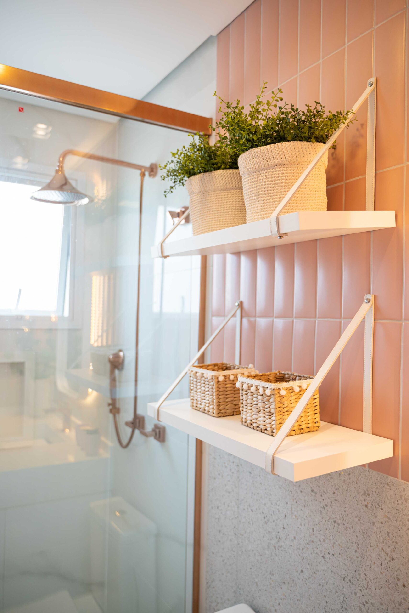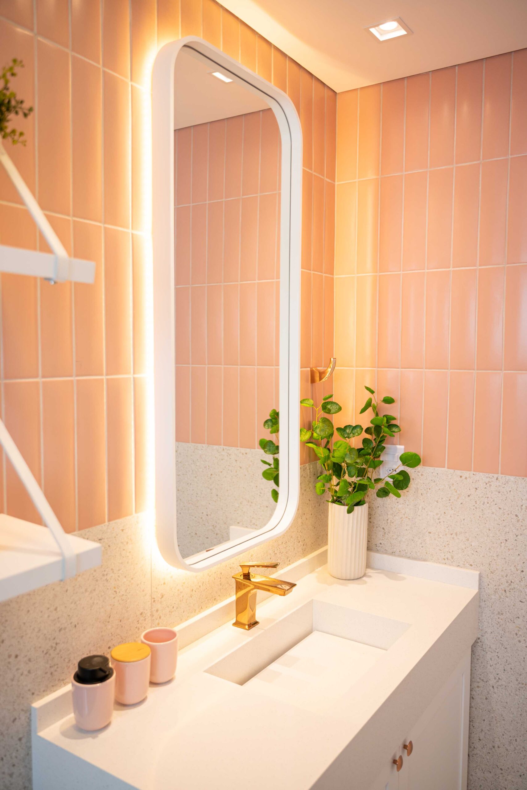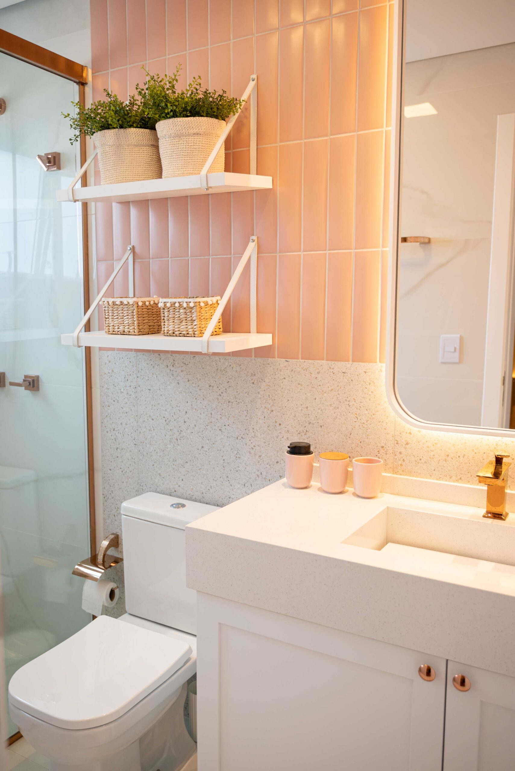 O projeto deste banheiro lindo e delicado conta com uma mistura de revestimentos, entre eles o marmorizado que já estava no banheiro, e junto com ele mesclamos um tijolinho rosa e um revestimento imitando granilite, trazendo essa combinação maravilhosa de tons claros e sutis. Junto com esses revestimentos, finalizamos essa composição com um balcão branco com molduras nas portas e um puxador super charmoso, um espelho com cantos arredondados e iluminação indireta dando ainda mais destaque para revestimento, prateleiras com alça em couro sobre o vaso com alguns itens de decoração e pra finalizar colocamos todos os metais do banheiro em rosê, deixando tudo mais harmônico.
