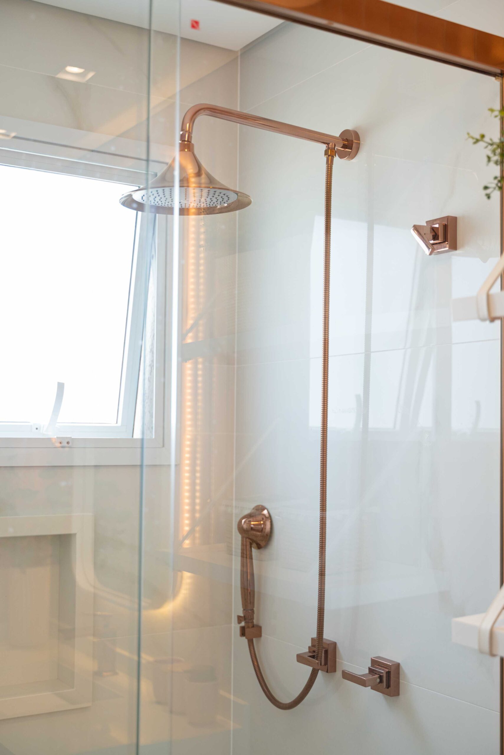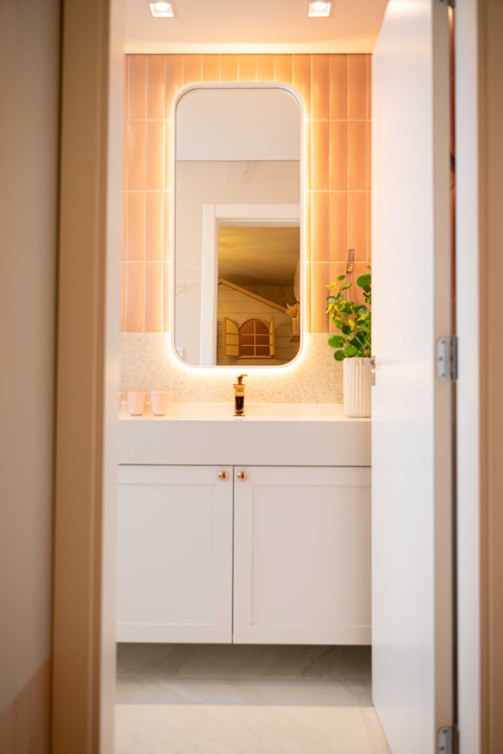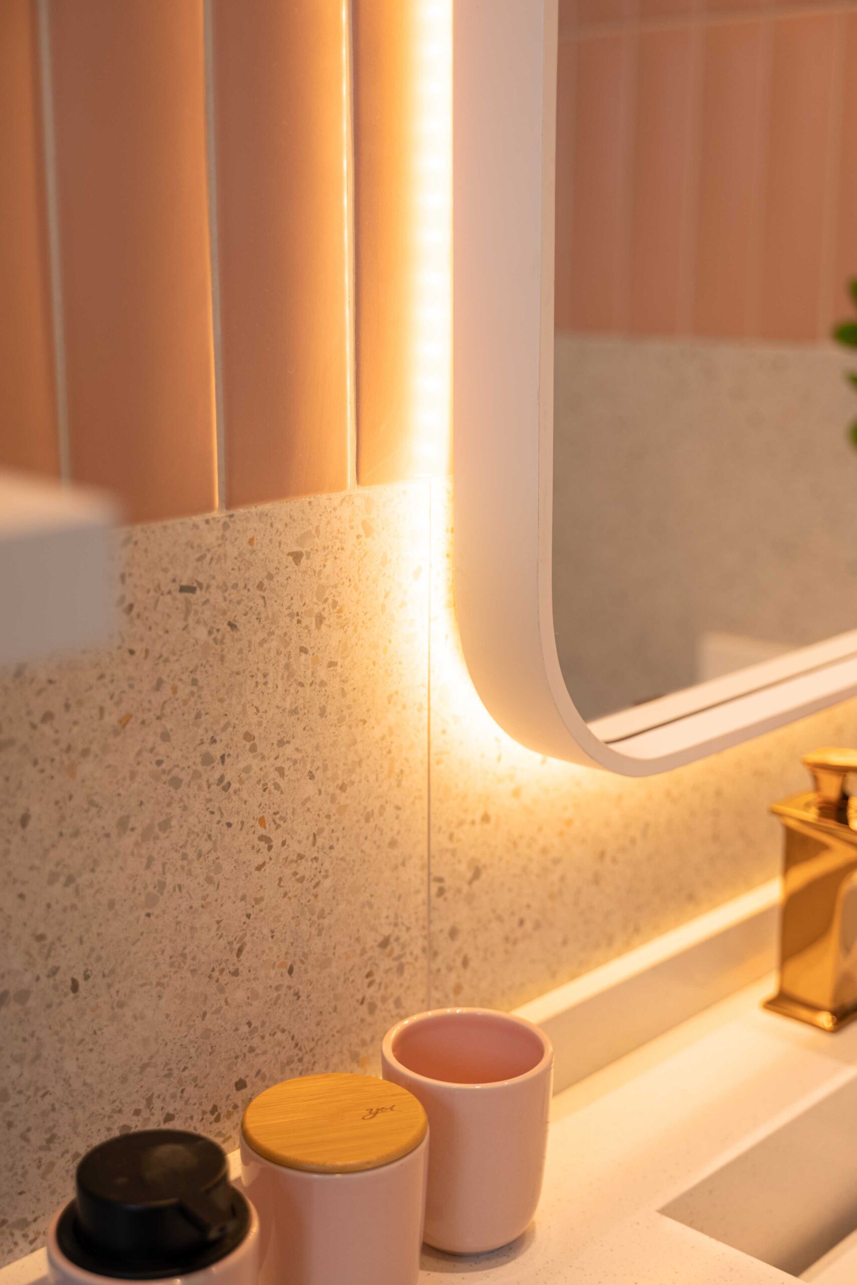 O projeto deste banheiro lindo e delicado conta com uma mistura de revestimentos, entre eles o marmorizado que já estava no banheiro, e junto com ele mesclamos um tijolinho rosa e um revestimento imitando granilite, trazendo essa combinação maravilhosa de tons claros e sutis. Junto com esses revestimentos, finalizamos essa composição com um balcão branco com molduras nas portas e um puxador super charmoso, um espelho com cantos arredondados e iluminação indireta dando ainda mais destaque para revestimento, prateleiras com alça em couro sobre o vaso com alguns itens de decoração e pra finalizar colocamos todos os metais do banheiro em rosê, deixando tudo mais harmônico.