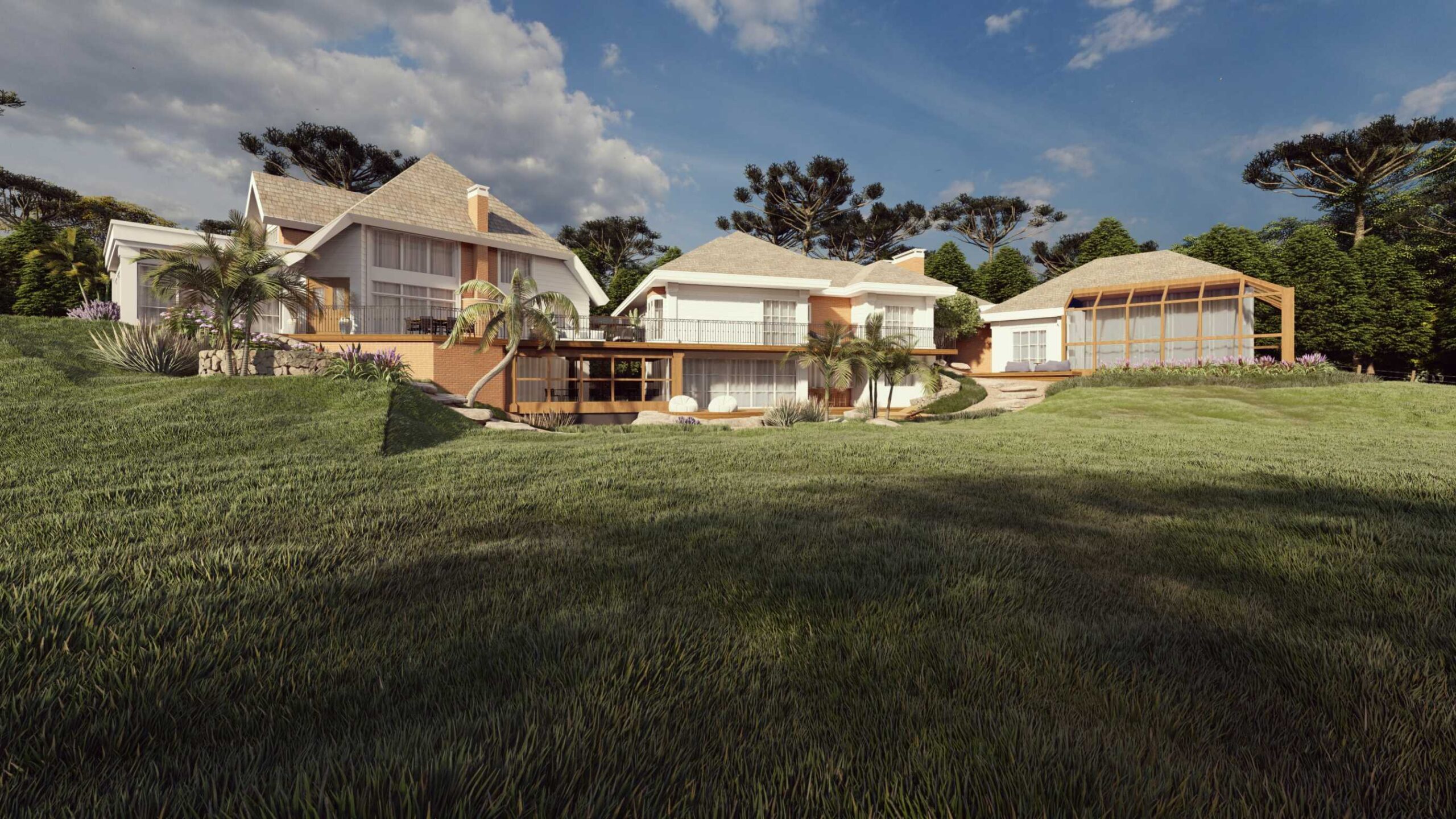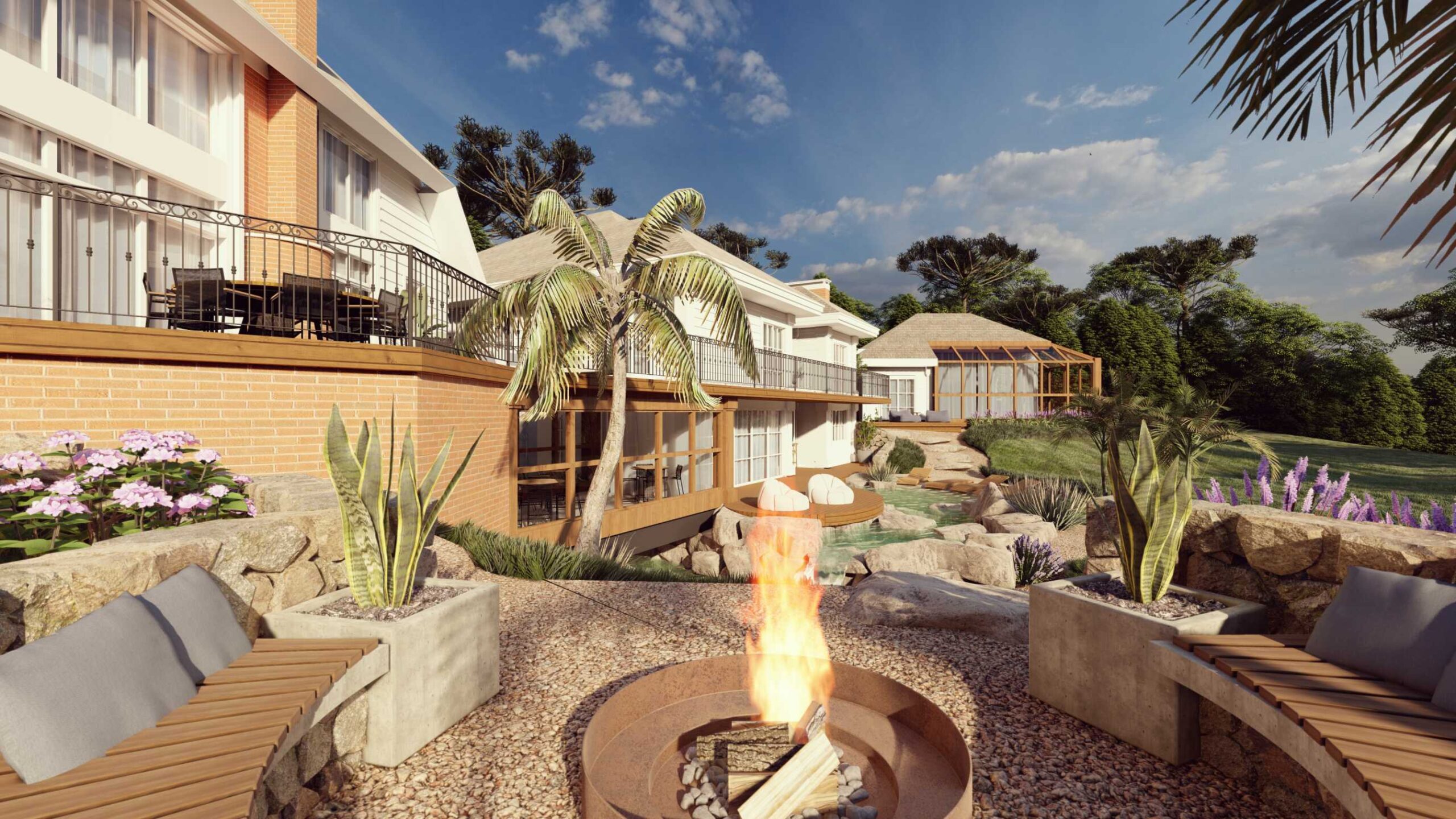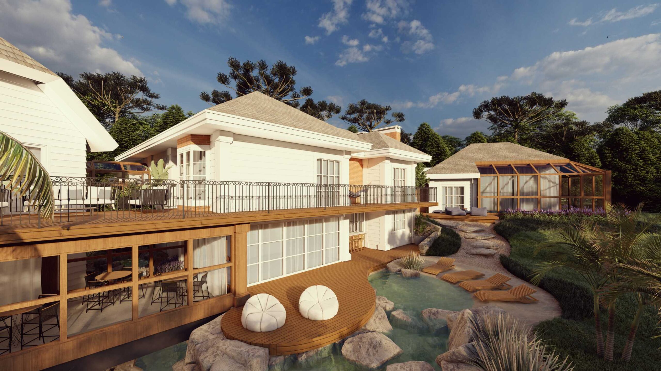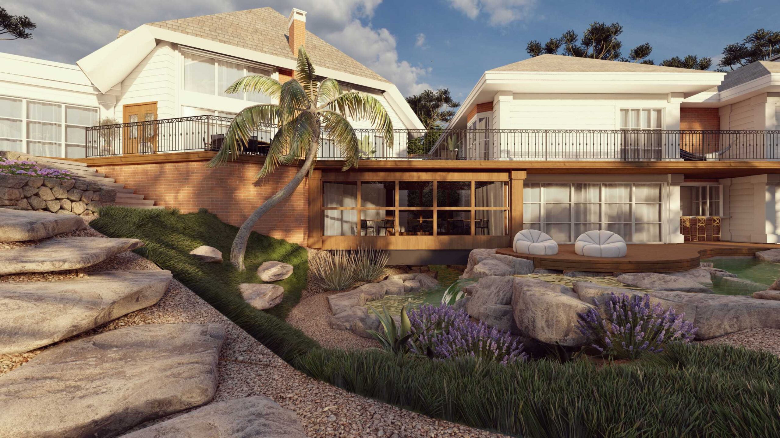 A casa conta com 3 volumes, o primeiro bloco é a casa existente, com pequenas ampliações, nesse volume com algumas reformas, concentramos a área social da casa: sala de estar, jantar, adega, cozinha e garagem. No volume central, deixamos a área intima da casa no pavimento térreo, que conta com 4 suítes, uma academia privativa, um ateliê, e área de serviço, e no subsolo desse volume, temos à área goumet, que tem lindas vistas para o lago, de vários ângulos, ela também conta com lounge, e brinquedoteca. E por fim, no ultimo bloco, temos uma piscina com vista para a natureza, com jacuzzi, lounge e copa.