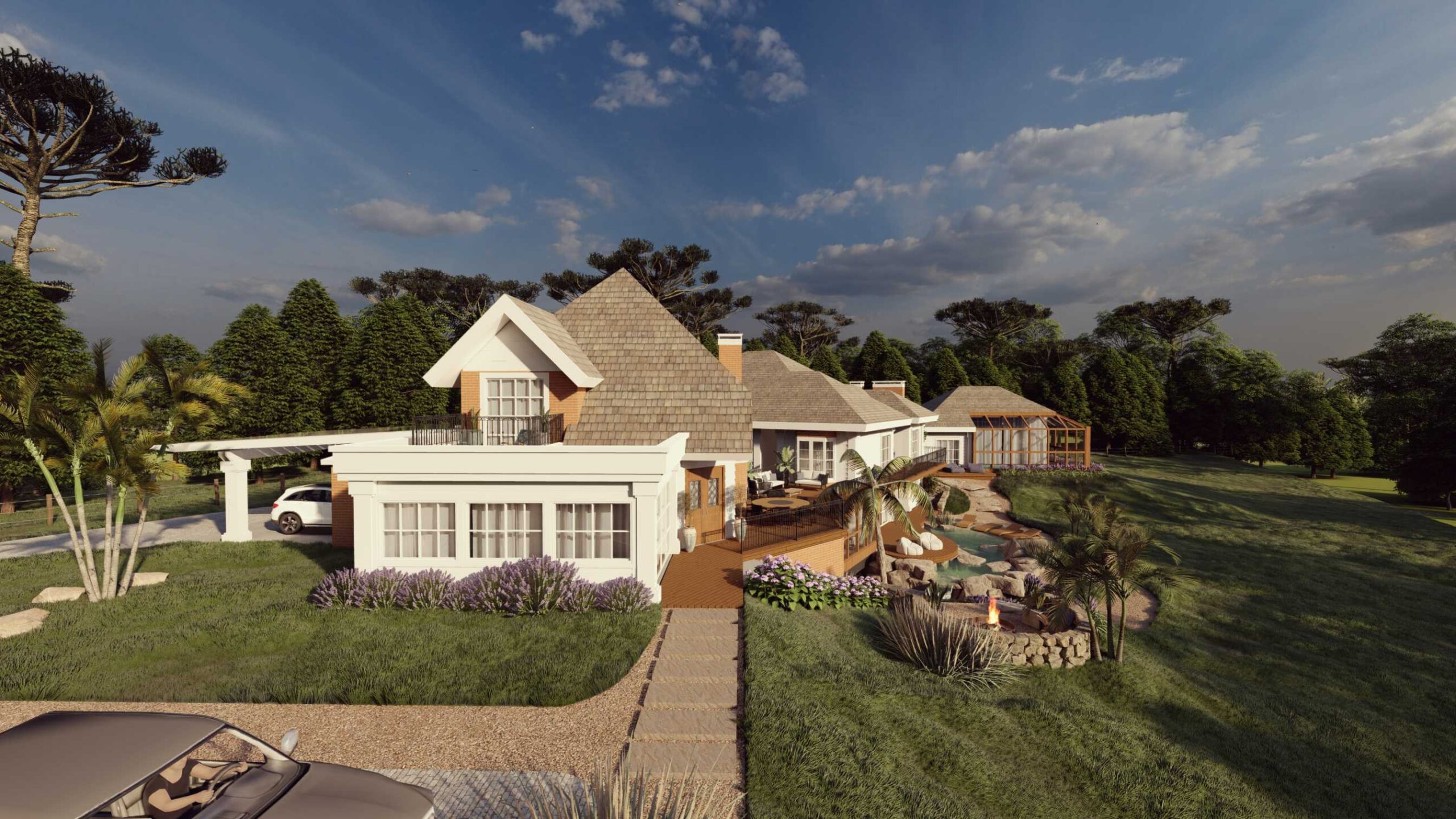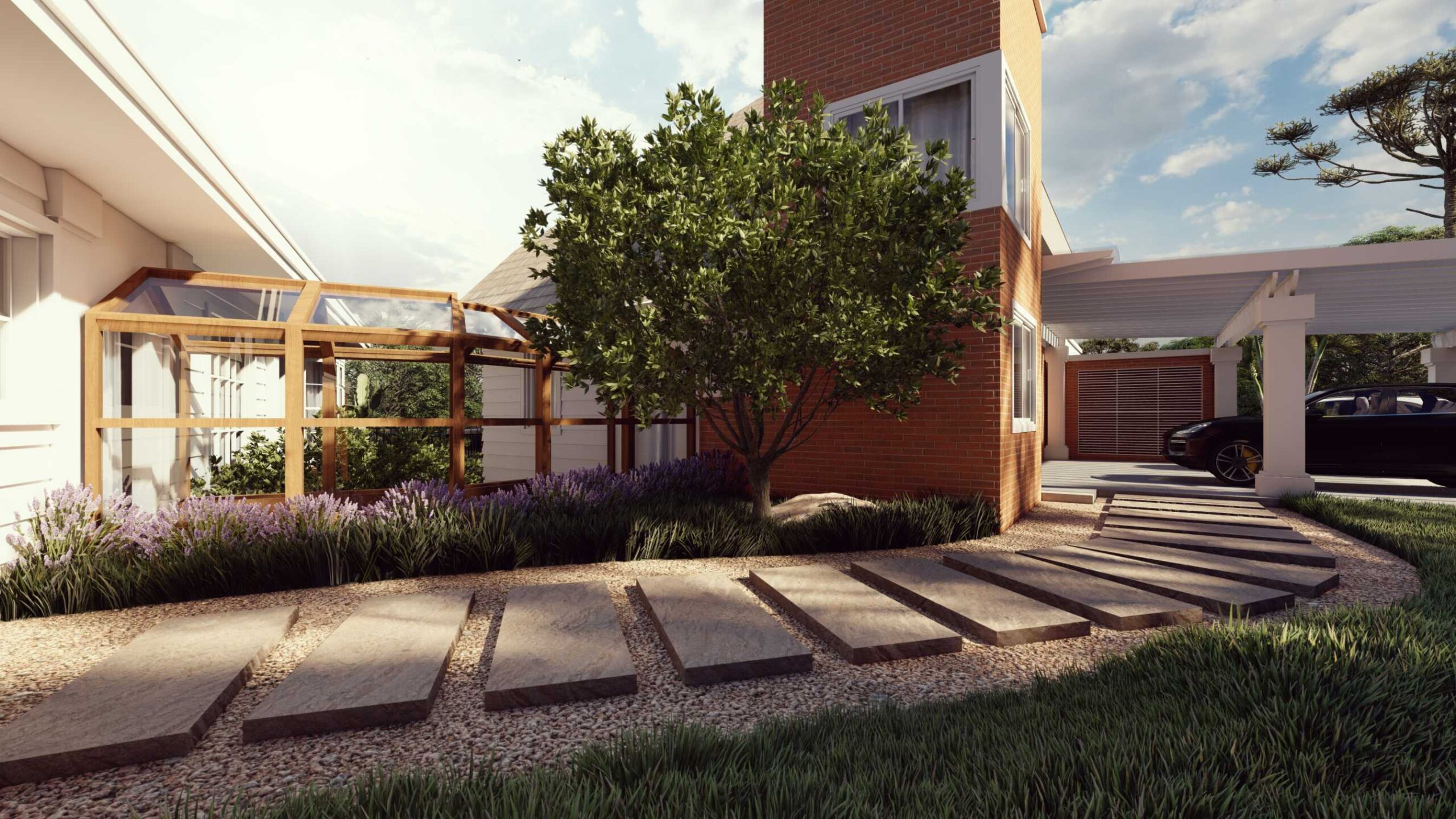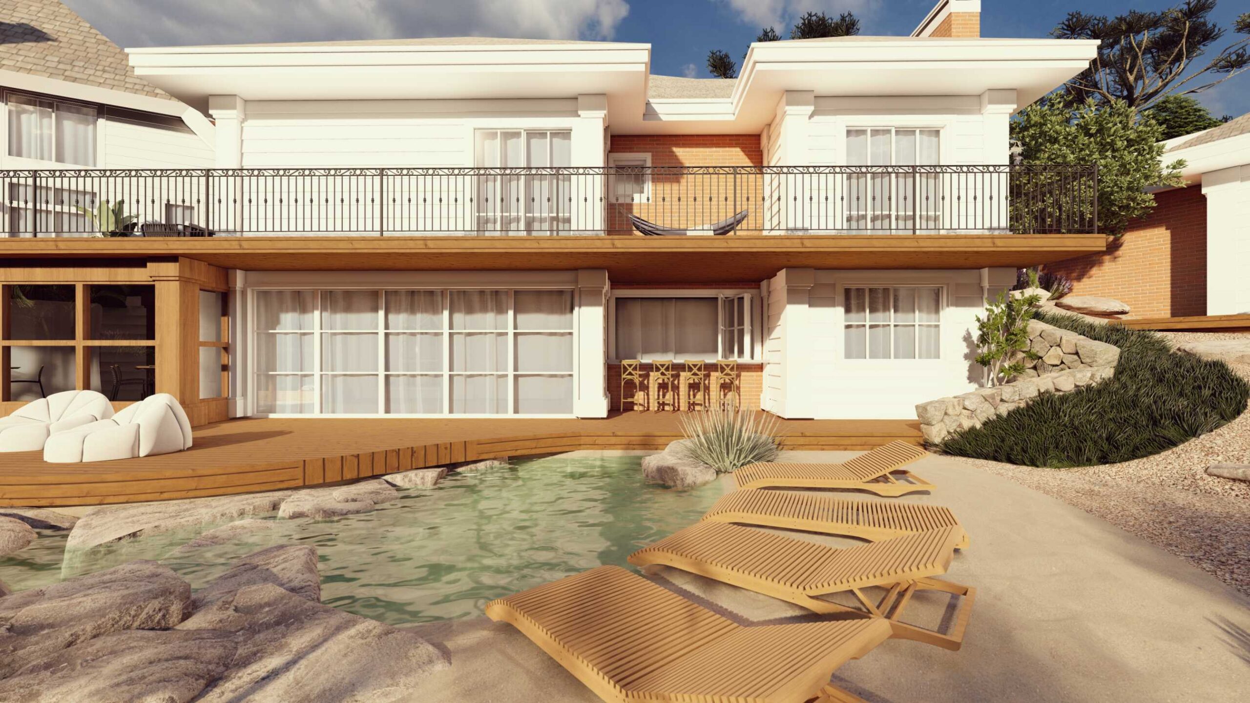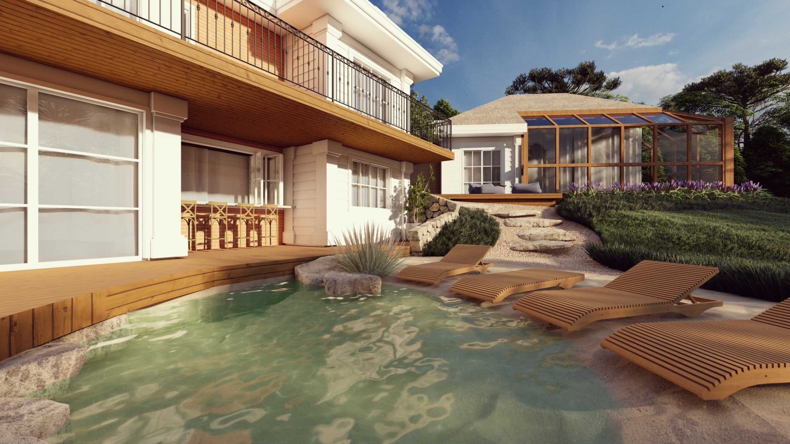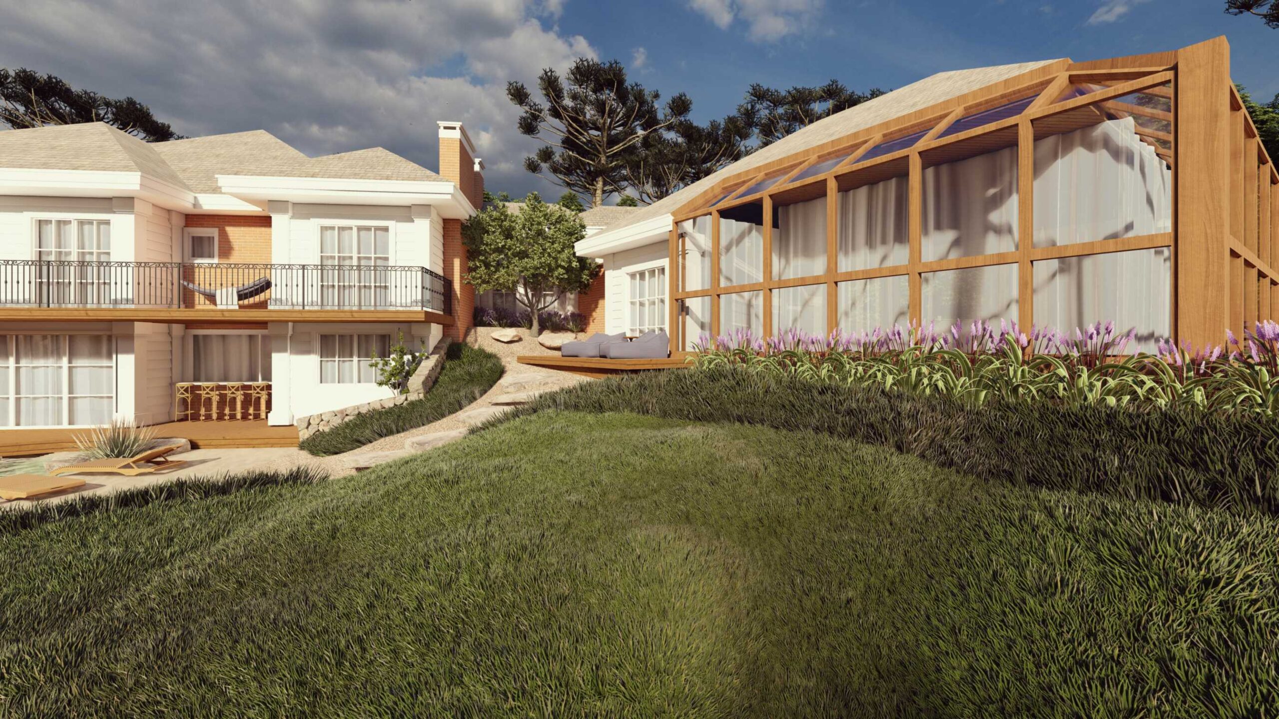 A casa conta com 3 volumes, o primeiro bloco é a casa existente, com pequenas ampliações, nesse volume com algumas reformas, concentramos a área social da casa: sala de estar, jantar, adega, cozinha e garagem. No volume central, deixamos a área intima da casa no pavimento térreo, que conta com 4 suítes, uma academia privativa, um ateliê, e área de serviço, e no subsolo desse volume, temos à área goumet, que tem lindas vistas para o lago, de vários ângulos, ela também conta com lounge, e brinquedoteca. E por fim, no ultimo bloco, temos uma piscina com vista para a natureza, com jacuzzi, lounge e copa.