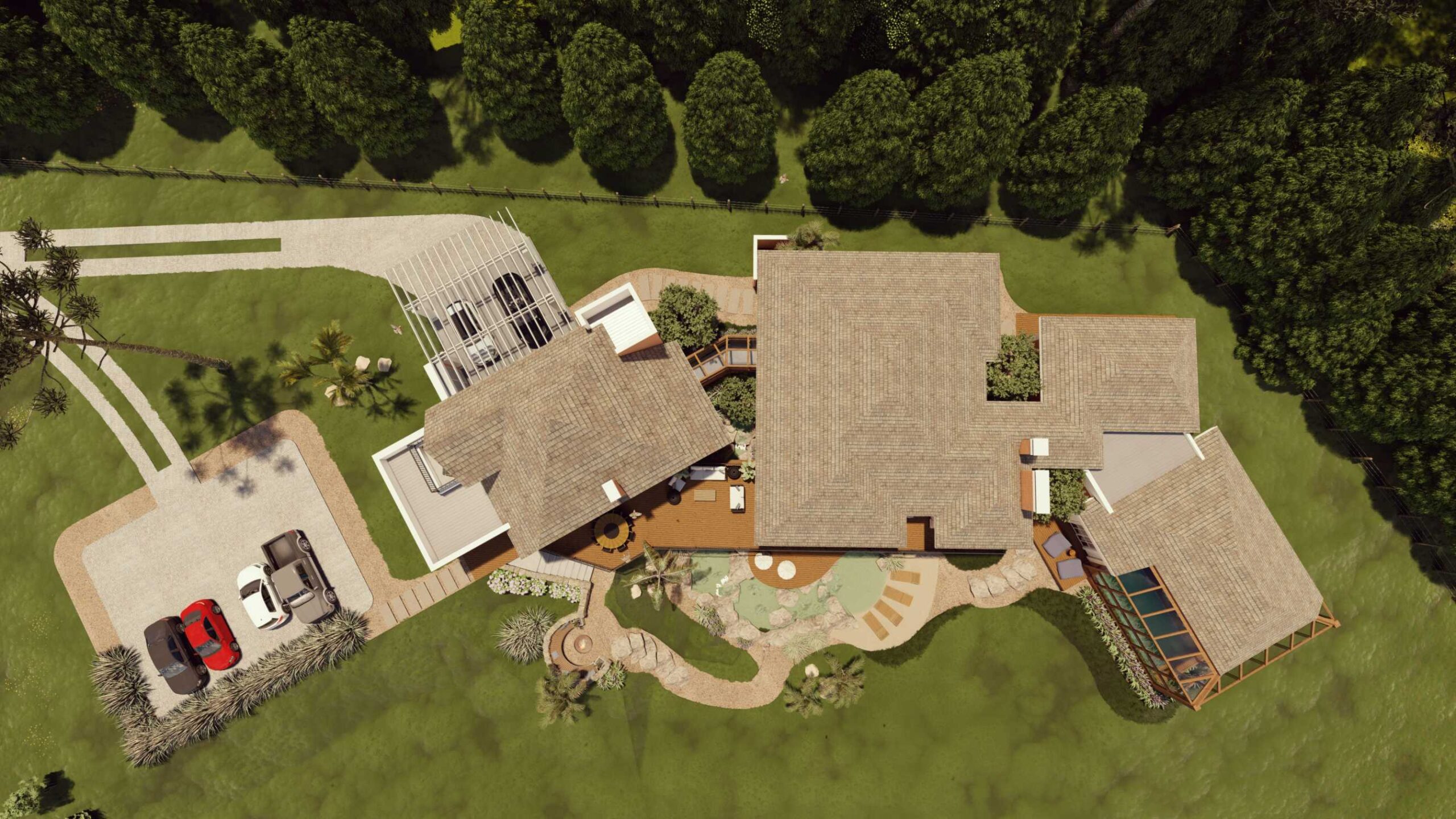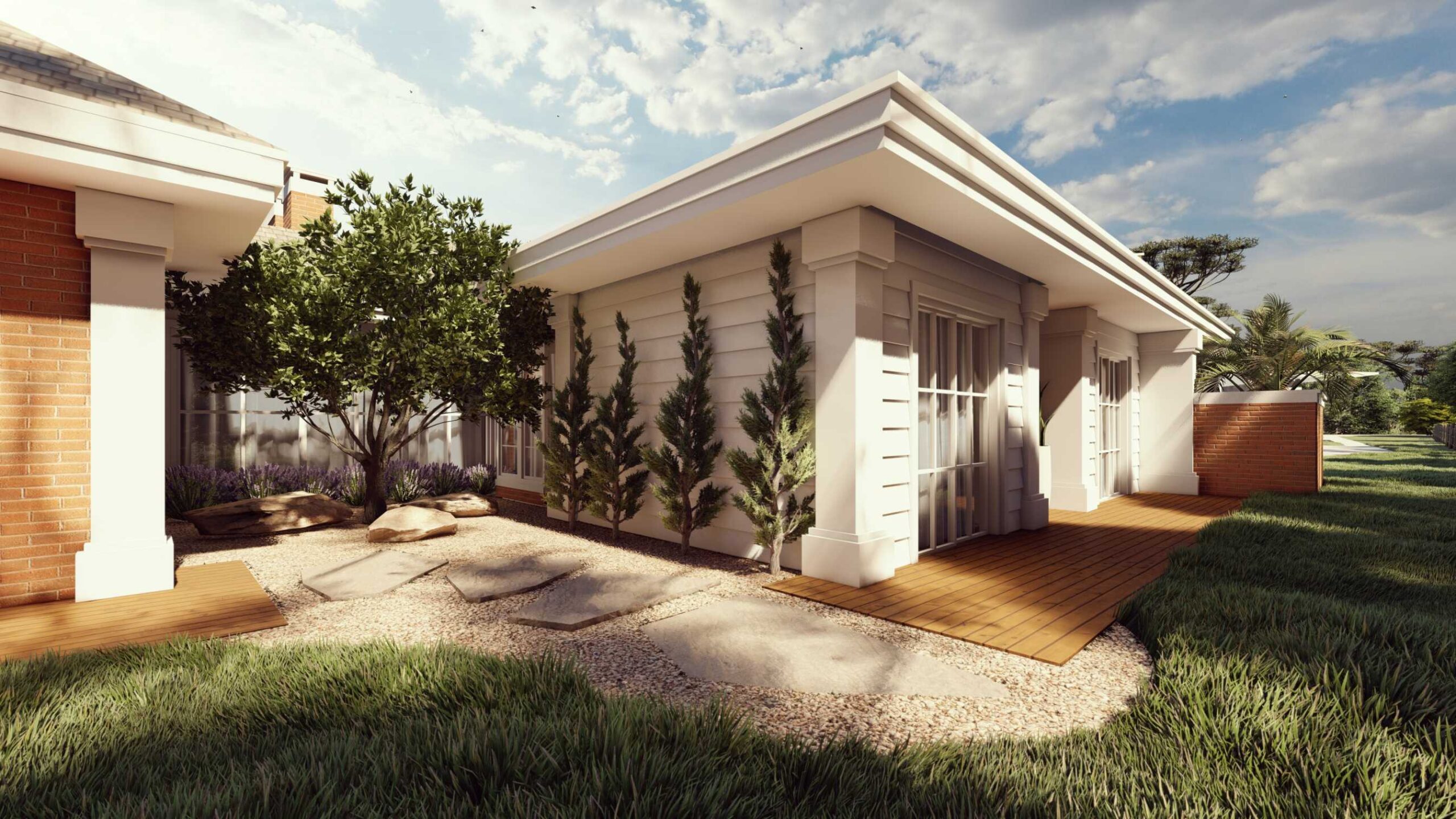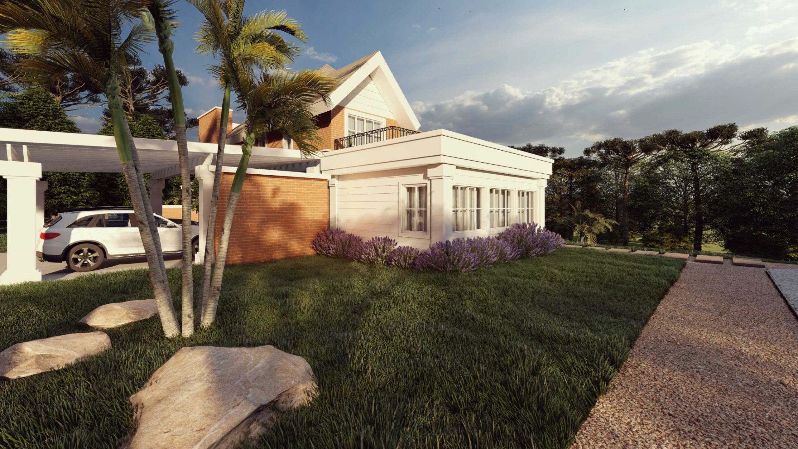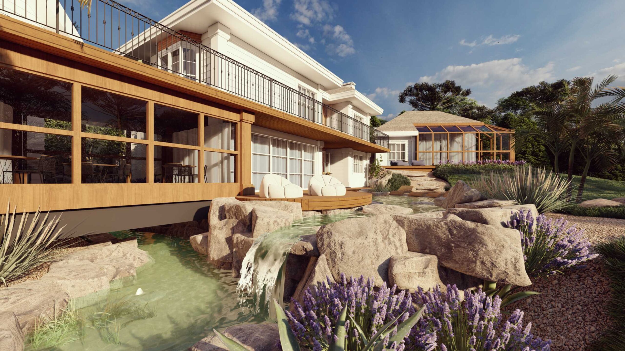 A casa conta com 3 volumes, o primeiro bloco é a casa existente, com pequenas ampliações, nesse volume com algumas reformas, concentramos a área social da casa: sala de estar, jantar, adega, cozinha e garagem. No volume central, deixamos a área intima da casa no pavimento térreo, que conta com 4 suítes, uma academia privativa, um ateliê, e área de serviço, e no subsolo desse volume, temos à área goumet, que tem lindas vistas para o lago, de vários ângulos, ela também conta com lounge, e brinquedoteca. E por fim, no ultimo bloco, temos uma piscina com vista para a natureza, com jacuzzi, lounge e copa.