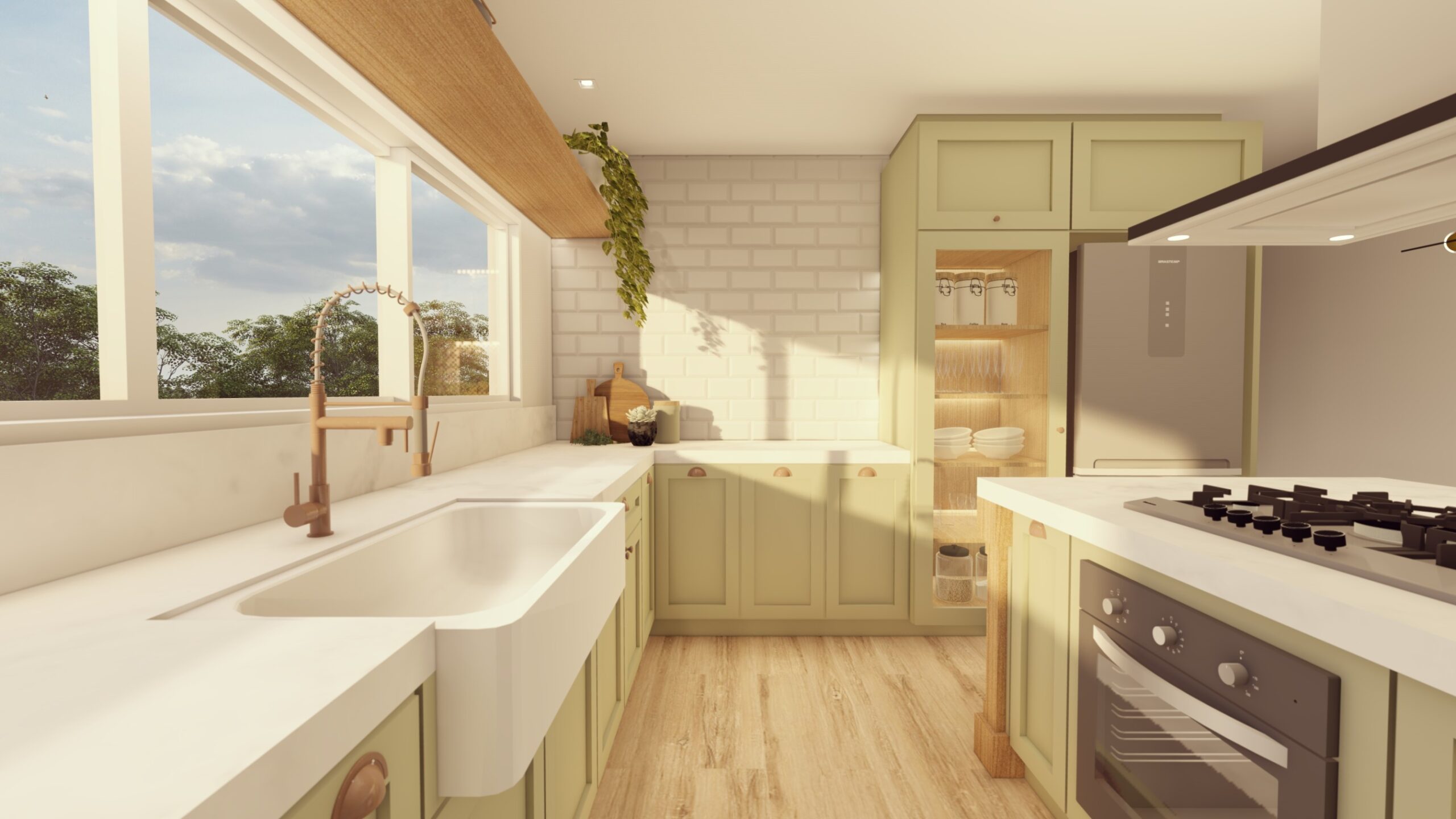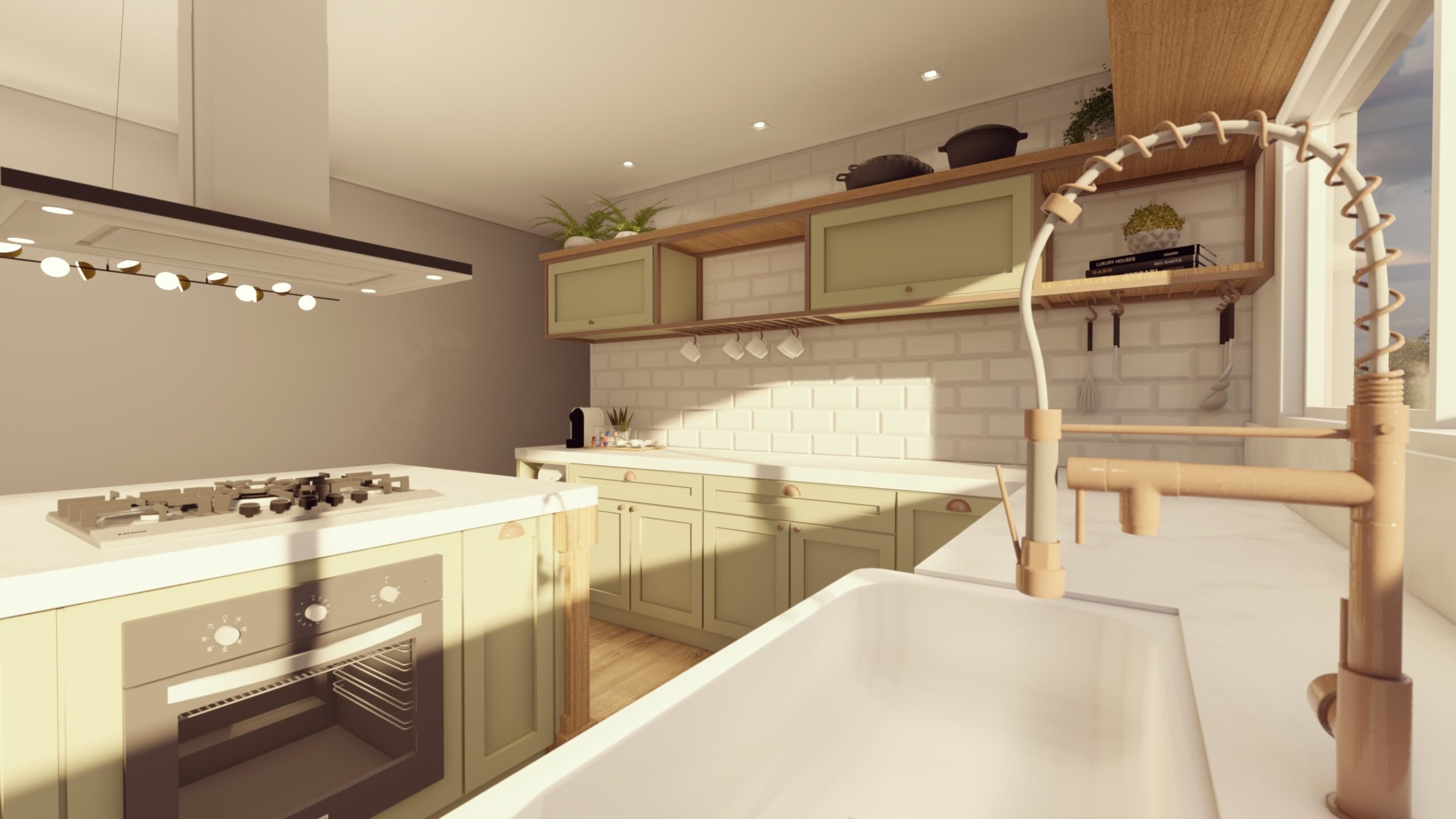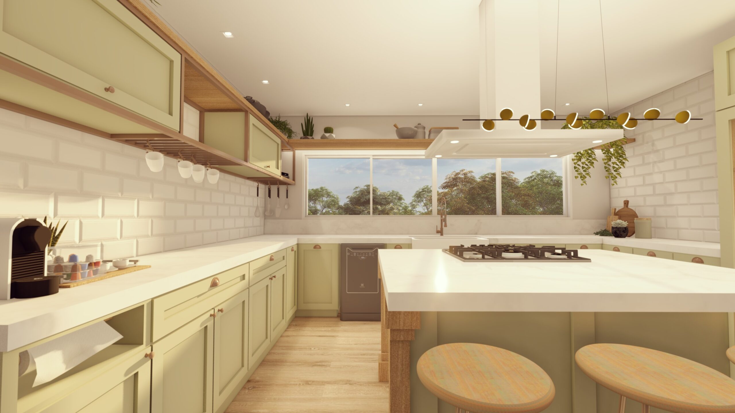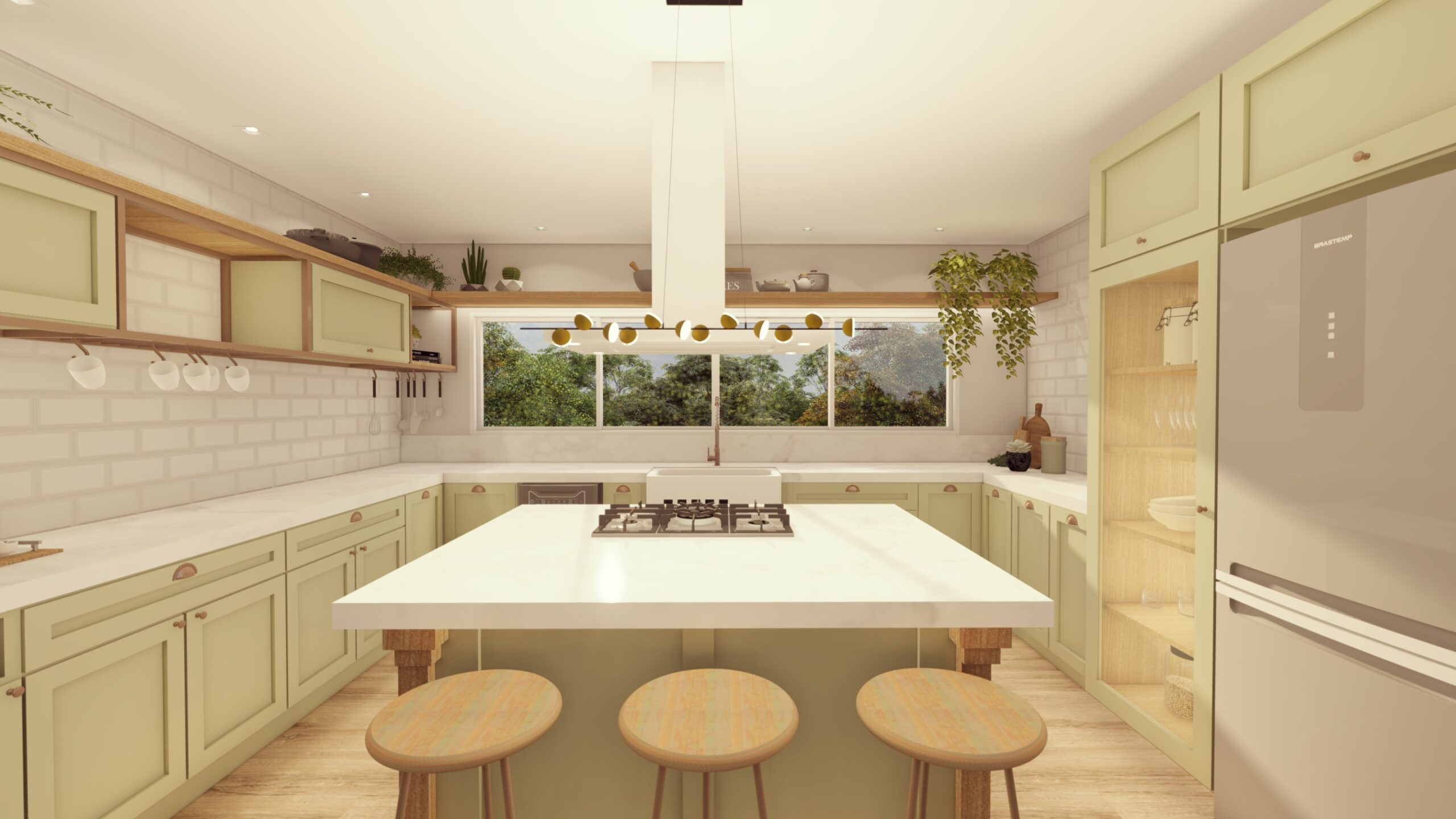 Essa cozinha é um charme em todos os seus detalhes, foi projetada no estilo provençal, marcado por portas com molduras e puxadores aparentes, em um tom de verde em composição com a cor bronze dos metais deixando tudo ainda mais encantador, uma cozinha dos sonhos.
