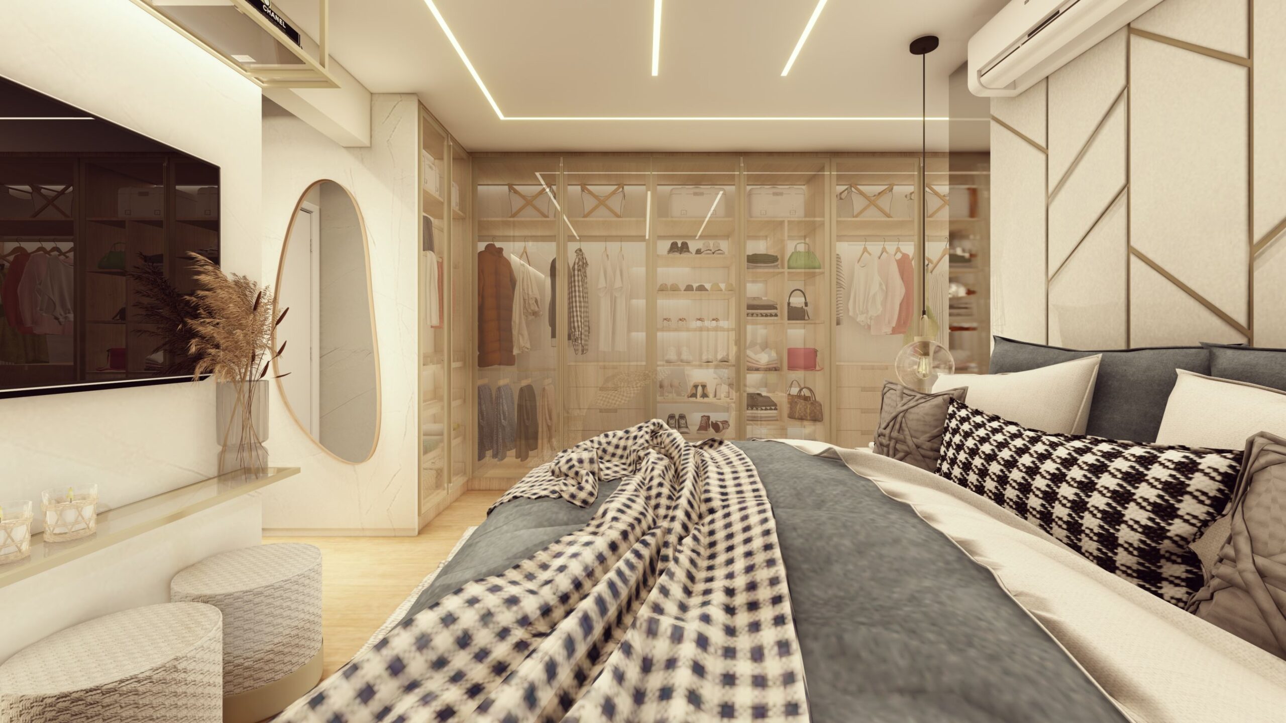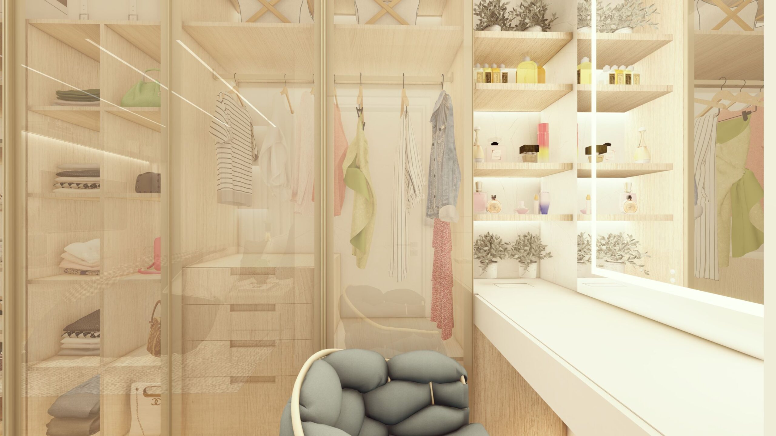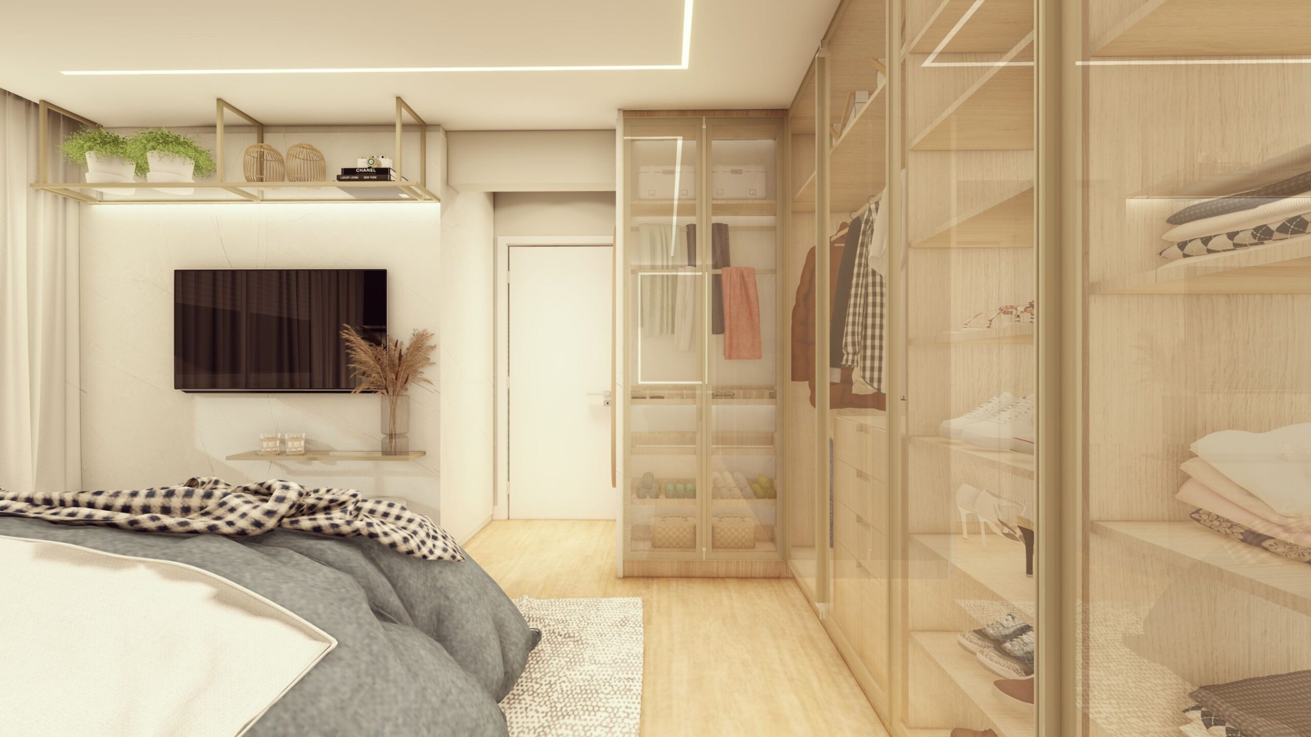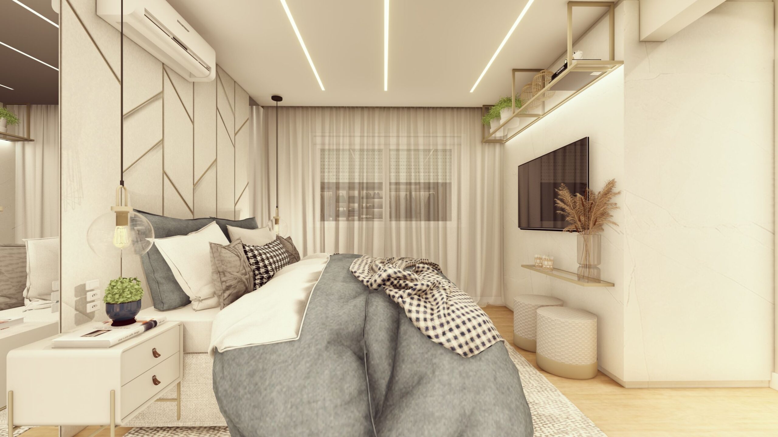 Essa linda suíte tem detalhes enriquecedores: uma cabeceira estofada dividida por canaletas douradas que trazem um detalhe especial para essa peça, um roupeiro com iluminação interna e portas em vidro reflecta bronze e algumas paredes revestidas em mdf imitando pedra, que trazem elegância e sofisticação para o espaço. Além disso temos uma penteadeira com espaço otimizado com gavetas para maquiagem, prateleiras para perfumes, iluminação embutida no espelho e uma caixa de tomadas no tampo para uso de secador.
