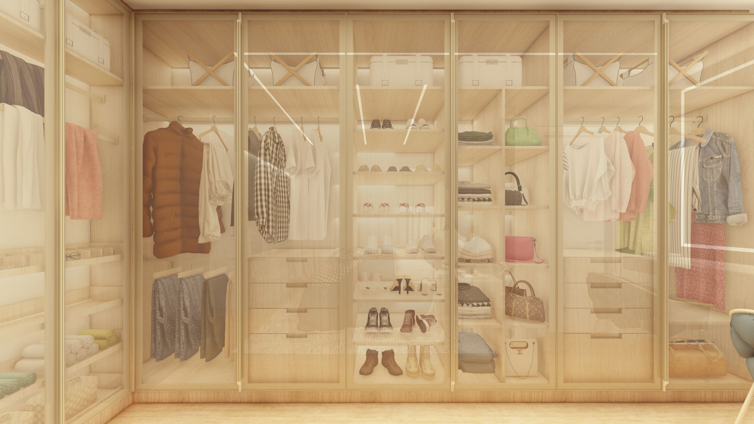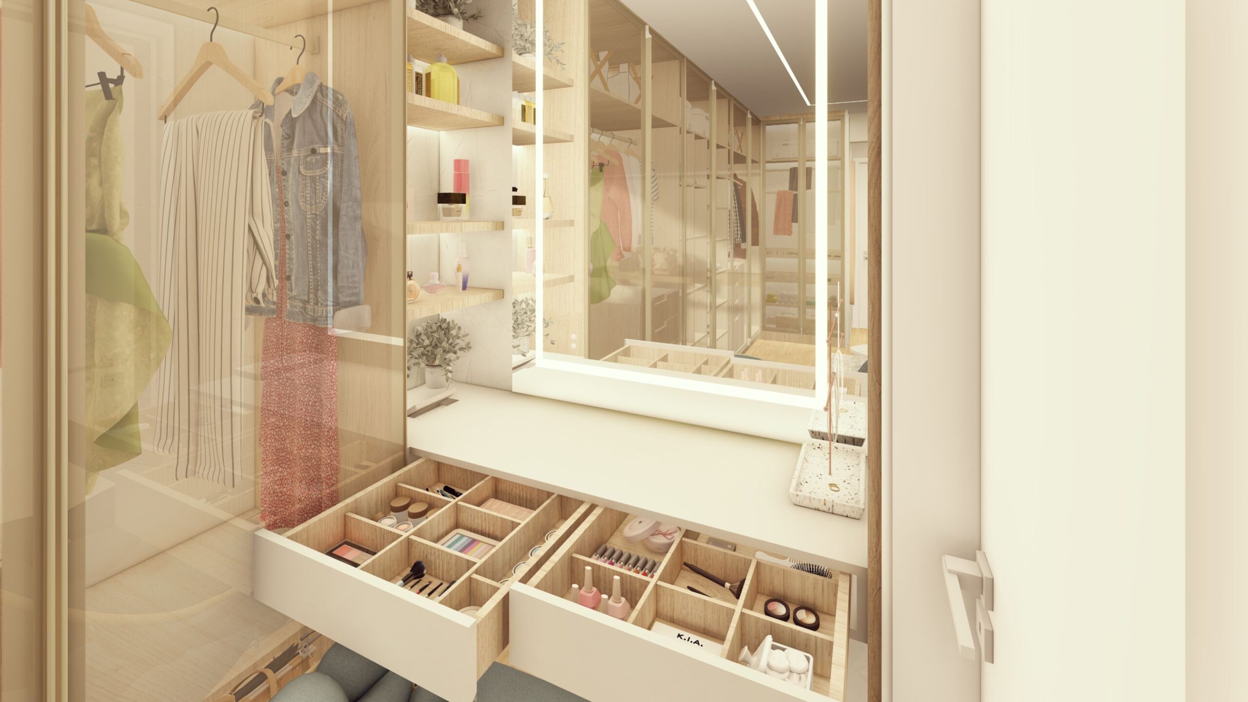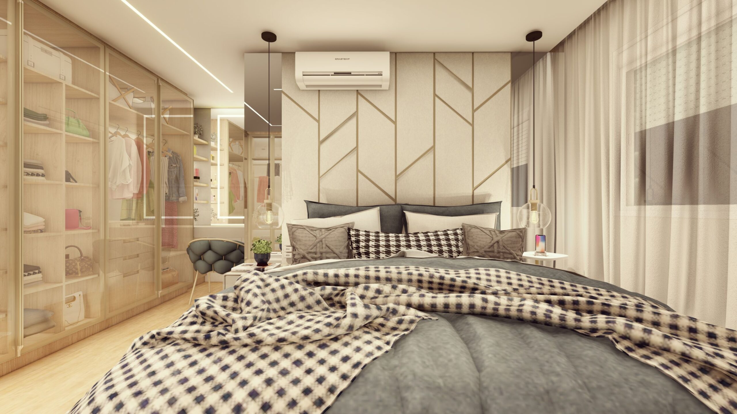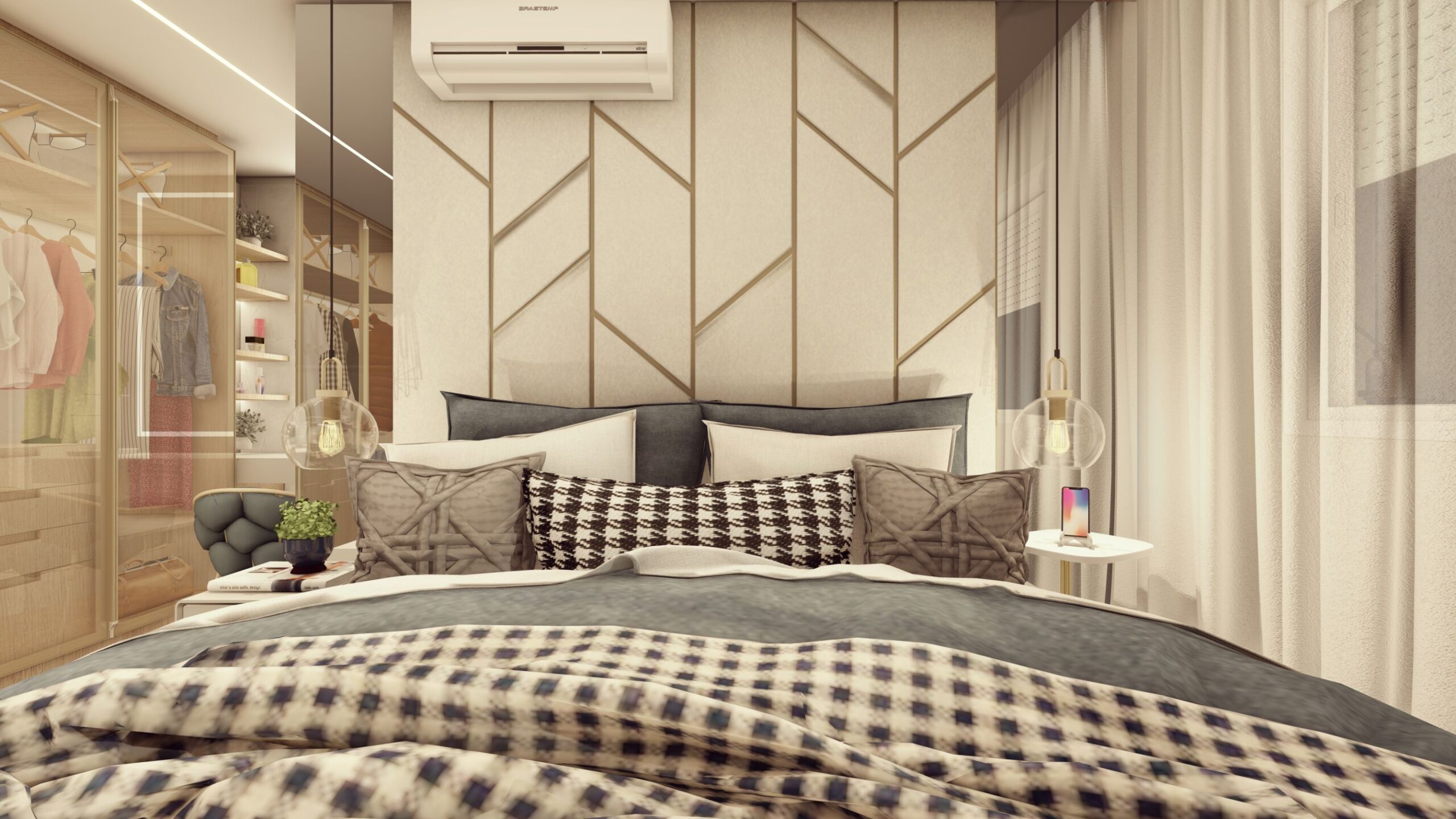 Essa linda suíte tem detalhes enriquecedores: uma cabeceira estofada dividida por canaletas douradas que trazem um detalhe especial para essa peça, um roupeiro com iluminação interna e portas em vidro reflecta bronze e algumas paredes revestidas em mdf imitando pedra, que trazem elegância e sofisticação para o espaço. Além disso temos uma penteadeira com espaço otimizado com gavetas para maquiagem, prateleiras para perfumes, iluminação embutida no espelho e uma caixa de tomadas no tampo para uso de secador.